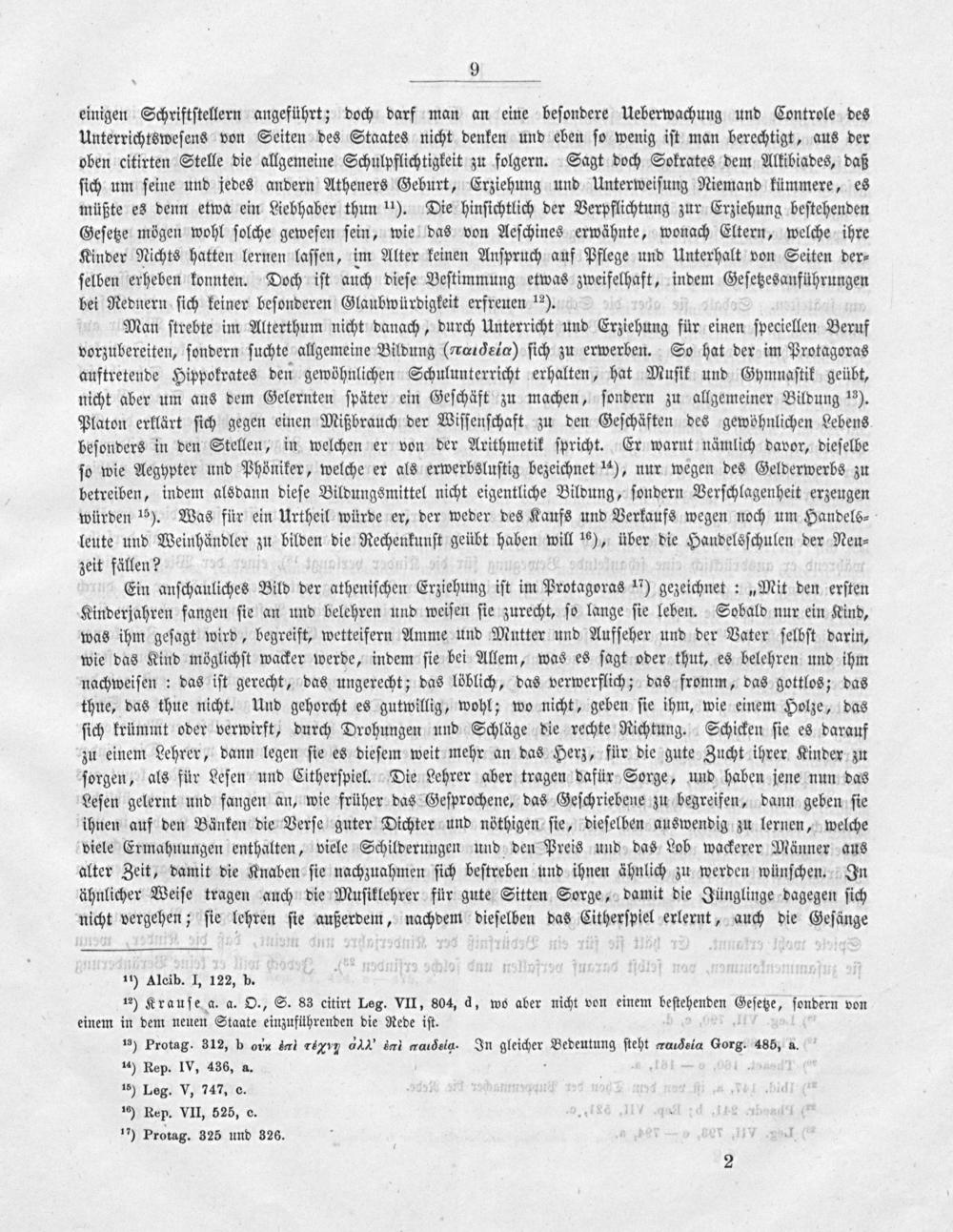 einigen Schriftſtellern angeführt; doch darf man an eine beſondere Ueberwachung und Controle des Unterrichtsweſens von Seiten des Staates nicht denken und eben ſo wenig iſt man berechtigt, aus der oben citirten Stelle die allgemeine Schulpflichtigkeit zu folgern. Sagt doch Sokrates dem Alkibiades, daß ſich um ſeine und jedes andern Atheners Geburt, Erziehung und Unterweiſung Niemand kümmere, es müßte es denn etwa ein Liebhaber thun ¹¹). Die hinſichtlich der Verpflichtung zur Erziehung beſtehenden Geſetze mögen wohl ſolche geweſen ſein, wie das von Aeſchines erwähnte, wonach Eltern, welche ihre Kinder Nichts hatten lernen laſſen, im Alter keinen Anſpruch auf Pflege und Unterhalt von Seiten der⸗ ſelben erheben konnten. Doch iſt auch dieſe Beſtimmung etwas zweifelhaft, indem Geſetzesanführungen bei Rednern ſich keiner beſonderen Glaubwürdigkeit erfreuen ¹²).