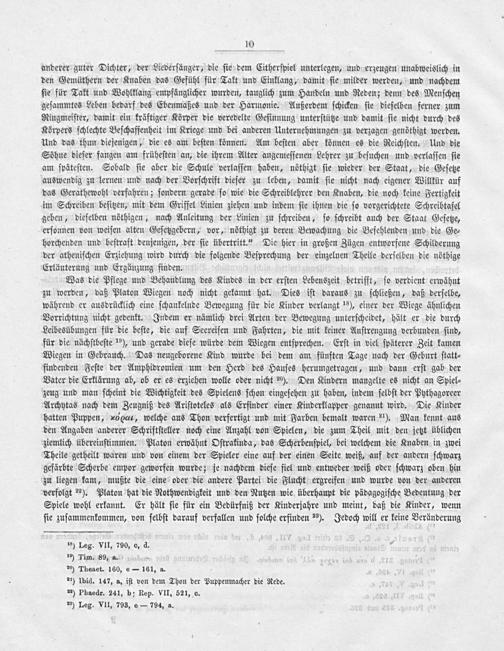anderer guter Dichter, der Liederſänger, die ſie dem Citherſpiel unterlegen, und erzeugen unabweislich in den Gemüthern der Knaben das Gefühl für Takt und Einklang, damit ſie milder werden, und nachdem ſie für Takt und Wohlklang empfänglicher wurden, tauglich zum Handeln und Reden; denn des Menſchen geſammtes Leben bedarf des Ebenmaßes und der Harmonie. Außerdem ſchicken ſie dieſelben ferner zum Ringmeiſter, damit ein kräftiger Körper die veredelte Geſinnung unterſtütze und damit ſie nicht durch des Körpers ſchlechte Beſchaffenheit im Kriege und bei anderen Unternehmungen zu verzagen genöthigt werden. Und das thun diejenigen, die es am beſten können. Am beſten aber können es die Reichſten. Und die Söhne dieſer fangen am früheſten an, die ihrem Alter angemeſſenen Lehrer zu beſuchen und verlaſſen ſie am ſpäteſten. Sobald ſie aber die Schule verlaſſen haben, nöthigt ſie wieder der Staat, die Geſetze auswendig zu lernen und nach der Vorſchrift dieſer zu leben, damit ſie nicht nach eigener Willkür auf das Gerathewohl verfahren; ſondern gerade ſo wie die Schreiblehrer den Knaben, die noch keine Fertigkeit im Schreiben beſitzen, mit dem Griffel Linien ziehen und indem ſie ihnen die ſo vorgerichtete Schreibtafel geben, dieſelben nöthigen, nach Anleitung der Linien zu ſchreiben, ſo ſchreibt auch der Staat Geſetze, erſonnen von weiſen alten Geſetzgebern, vor, nöthigt zu deren Bewachung die Befehlenden und die Ge⸗ horchenden und beſtraft denjenigen, der ſie übertritt.“ Die hier in großen Zügen entworfene Schilderung der atheniſchen Erziehung wird durch die folgende Beſprechung der einzelnen Theile derſelben die nöthige Erläuterung und Ergänzung finden.