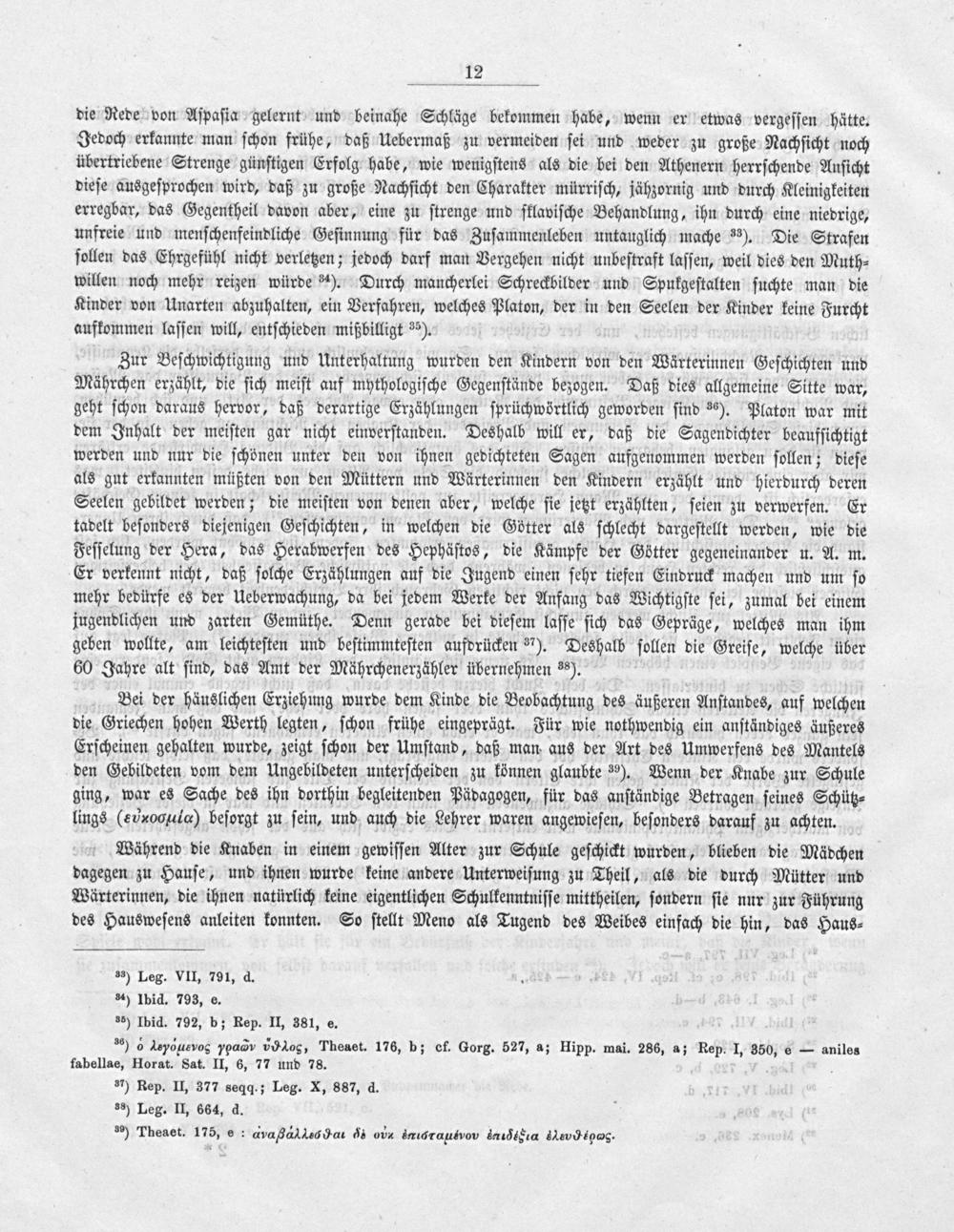 die Rede von Aſpaſia gelernt und beinahe Schläge bekommen habe, wenn er etwas vergeſſen hätte. Jedoch erkannte man ſchon frühe, daß Uebermaß zu vermeiden ſei und weder zu große Nachſicht noch übertriebene Strenge günſtigen Erfolg habe, wie wenigſtens als die bei den Athenern herrſchende Anſicht dieſe ausgeſprochen wird, daß zu große Nachſicht den Charakter mürriſch, jähzornig und durch Kleinigkeiten erregbar, das Gegentheil davon aber, eine zu ſtrenge und ſklaviſche Behandlung, ihn durch eine niedrige, unfreie und menſchenfeindliche Geſinnung für das Zuſammenleben untauglich mache ³³). Die Strafen ſollen das Ehrgefühl nicht verletzen; jedoch darf man Vergehen nicht unbeſtraft laſſen, weil dies den Muth⸗ willen noch mehr reizen würde ³⁴). Durch mancherlei Schreckbilder und Spukgeſtalten ſuchte man die Kinder von Unarten abzuhalten, ein Verfahren, welches Platon, der in den Seelen der Kinder keine Furcht aufkommen laſſen will, entſchieden mißbilligt ³5).
