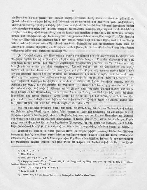 Zur Beſchwichtigung und Unterhaltung wurden den Kindern von den Wärterinnen Geſchichten und Mährchen erzählt, die ſich meiſt auf mythologiſche Gegenſtände bezogen. Daß dies allgemeine Sitte war, geht ſchon daraus hervor, daß derartige Erzählungen ſprüchwörtlich geworden ſind 36). Platon war mit dem Inhalt der meiſten gar nicht einverſtanden. Deshalb will er, daß die Sagendichter beaufſichtigt werden und nur die ſchönen unter den von ihnen gedichteten Sagen aufgenommen werden ſollen; dieſe als gut erkannten müßten von den Müttern und Wärterinnen den Kindern erzählt und hierdurch deren Seelen gebildet werden; die meiſten von denen aber, welche ſie jetzt erzählten, ſeien zu verwerfen. Er tadelt beſonders diejenigen Geſchichten, in welchen die Götter als ſchlecht dargeſtellt werden, wie die Feſſelung der Hera, das Herabwerfen des Hephäſtos, die Kämpfe der Götter gegeneinander u. A. m. Er verkennt nicht, daß ſolche Erzählungen auf die Jugend einen ſehr tiefen Eindruck machen und um ſo mehr bedürfe es der Ueberwachung, da bei jedem Werke der Anfang das Wichtigſte ſei, zumal bei einem jugendlichen und zarten Gemüthe. Denn gerade bei dieſem laſſe ſich das Gepräge, welches man ihm geben wollte, am leichteſten und beſtimmteſten aufdrücken ³7). Deshalb ſollen die Greiſe, welche über 60 Jahre alt ſind, das Amt der Mährchenerzähler übernehmen 3s).—