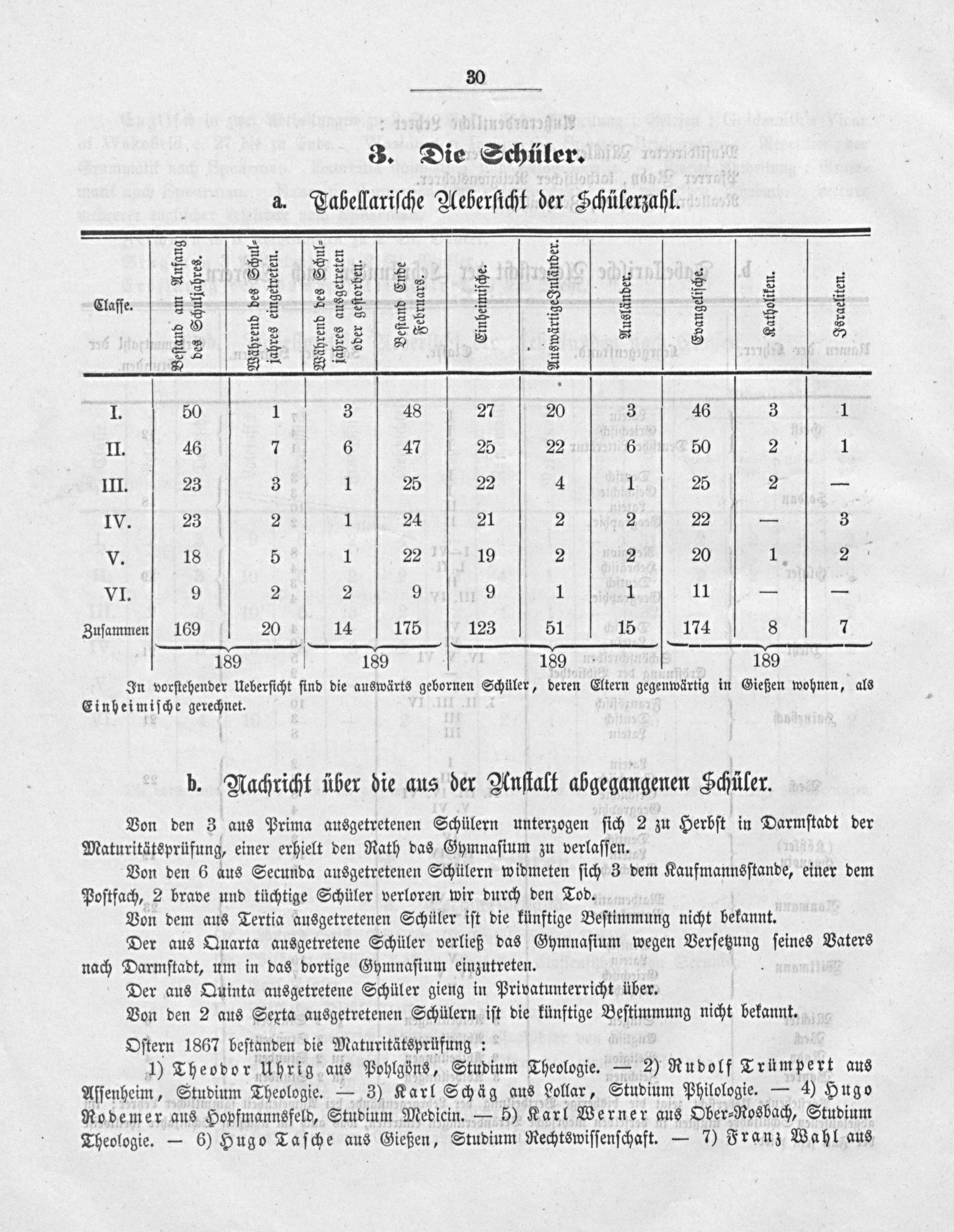 In vorſtehender Ueberſicht ſind die auswärts gebornen Schüler, deren Eltern gegenwärtig in Gießen wohnen, als Einheimiſche gerechnet.