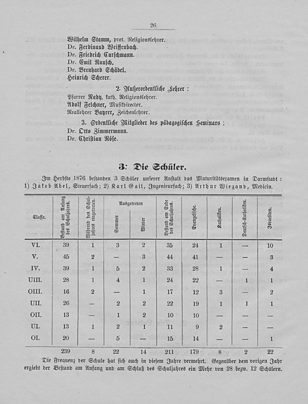 3: Die Schüler. Im Herbſte 1876 beſtanden 3 Schüler unſerer Anſtalt das Maturitätsexamen in Darmſtadt: 1) Jakob Abel, Steuerfach; 2) Karl Gail, Ingenieurfach; 3) Arthur Wiegand, Medicin.