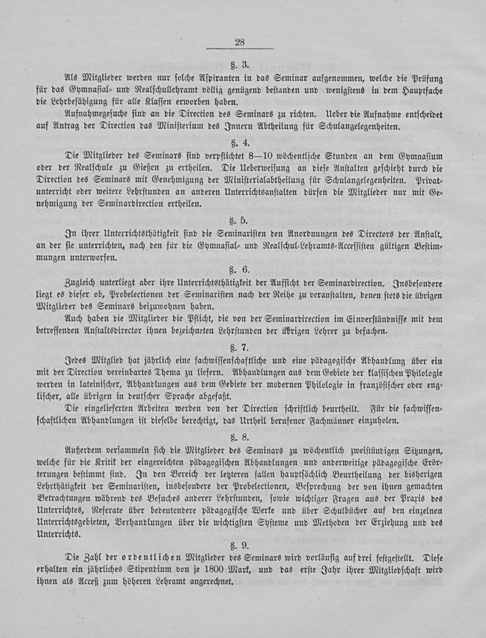 Jedes Mitglied hat jährlich eine fachwiſſenſchaftliche und eine pädagogiſche Abhandlung über ein mit der Direction vereinbartes Thema zu liefern. Abhandlungen aus dem Gebiete der klaſſiſchen Philologie werden in lateiniſcher, Abhandlungen aus dem Gebiete der modernen Philologie in franzöſiſcher oder eng⸗ liſcher, alle übrigen in deutſcher Sprache abgefaßt.