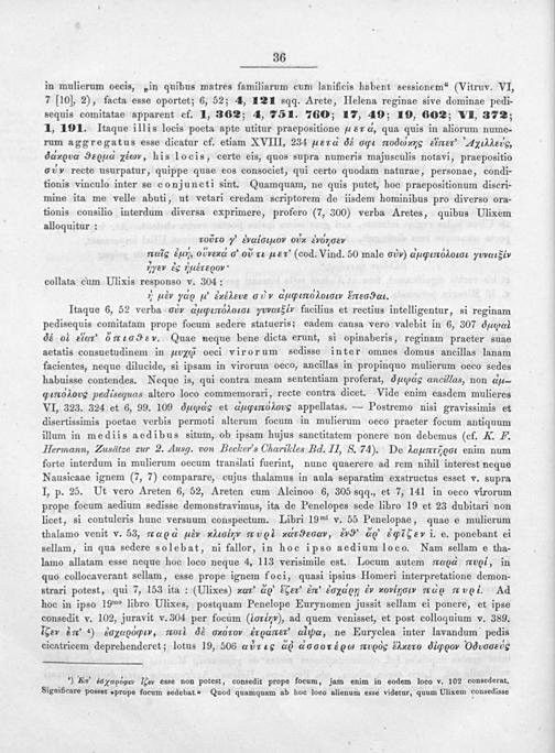 in mulierum oecis,„in quibus matres familiarum cum lanificis habent sessionem“(Vitruv. VI, 7[10], 2), facta esse oportet; 6, 52; 4, 121 sqq. Arete, Helena reginae sive dominae pedi- sequis comitatae apparent cf. 1, 362; 4, 751. 760; 17, 49; 19, 602; VI, 372; 1, 191. Itaque illis locis poeta apte utitur praepositione*εντ, qua quis in aliorum nume- rum aggregatus esse dicatur cf. etiam XVIII, 234 Aετ⁴ εέ ⁶mσ ττο⁶α κάσ iεεν xdeug, ddrουαάα ϑεςμαα εααν, his locis, certe eis, quos supra numeris majusculis notavi, praepositio g⁵⁴ recte usurpatur, quippe quae eos consociet, qui certo quodam naturae, personae, condi- tionis vinculo inter se conjuncti sint. Quamquam, ne quis putet, hoc praepositionum diseri- mine ita me velle abuti, ut vetari credam scriptorem de iisdem hominibus pro diverso ora- tionis consilio interdum diversa exprimere, profero(7, 300) verba Aretes, quibus Ulixem alloquitur: 1 roũo&᷑ναoιιαον odν νυeνσευν