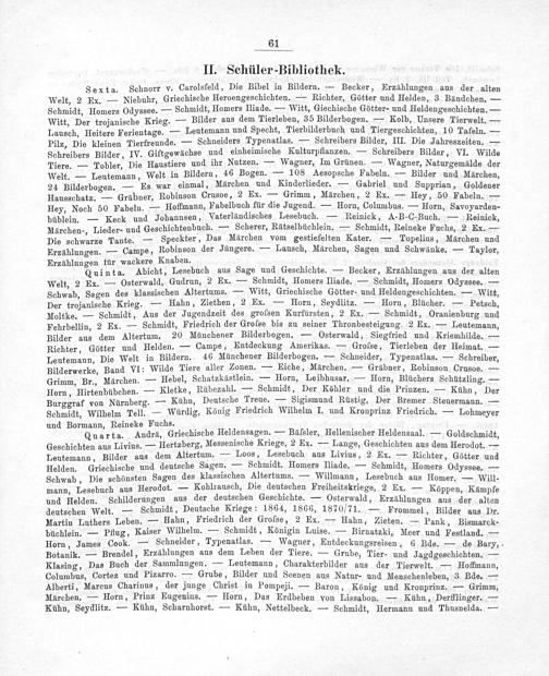 Quinta. Abicht, Lesebuch aus Sage und Geschichte.— Becker, Erzählungen aus der alten Welt, 2 Ex.— Osterwald, Gudrun, 2 Ex.— Schmidt, Homers Iliade.— Schmidt, Homers Odyssee.— Schwab, Sagen des klassischen Altertums.— Witt, Griechische Götter- und Heldengeschichten.— Witt, Der trojanische Krieg.— Hahn, Ziethen, 2 Ex.— Horn, Seydlitz.— Horn, Blücher.— Petsch, Moltke.— Schmidt, Aus der Jugendzeit des grolsen Kurfürsten, 2 Ex.— Schmidt, Oranienburg und Fehrbellin, 2 Ex.— Schmidt, Friedrich der Groſse bis zu seiner Thronbesteigung. 2 Ex.— Leutemann, Bilder aus dem Altertum. 20 Münchener Bilderbogen.— Osterwald, Siegfried und Kriemhilde.— Richter, Götter und Helden.— Campe, Entdeckung Amerikas.— Groſse, Tierleben der Heimat.— Leutemann, Die Welt in Bildern. 46 Mäünchener Bilderbogen.— Schneider, Typenatlas.— Schreiber, Bilderwerke, Band VI: Wilde Tiere aller Zonen.— Eiche, Märchen.— Gräbner, Robinson Crusoe.— Grimm, Br., Märchen.— Hebel, Schatzkästlein.— Horn, Leibhusar.— Horn, Blüchers Schützling.— Horn, Hirtenbübchen.— Kletke, Rübezahl.— Schmidt, Der Köhler und die Prinzen.— Kühn, Der Burggraf von Nürnberg.— Kühn, Deutsche Treue.— Sigismund Rüstig, Der Bremer Steuermann.— Schmidt, Wilhelm Tell.— Würdig, König Friedrich Wilhelm I. und Kronprinz Friedrich.— Lohmeyer und Bormann, Reineke Fuchs.