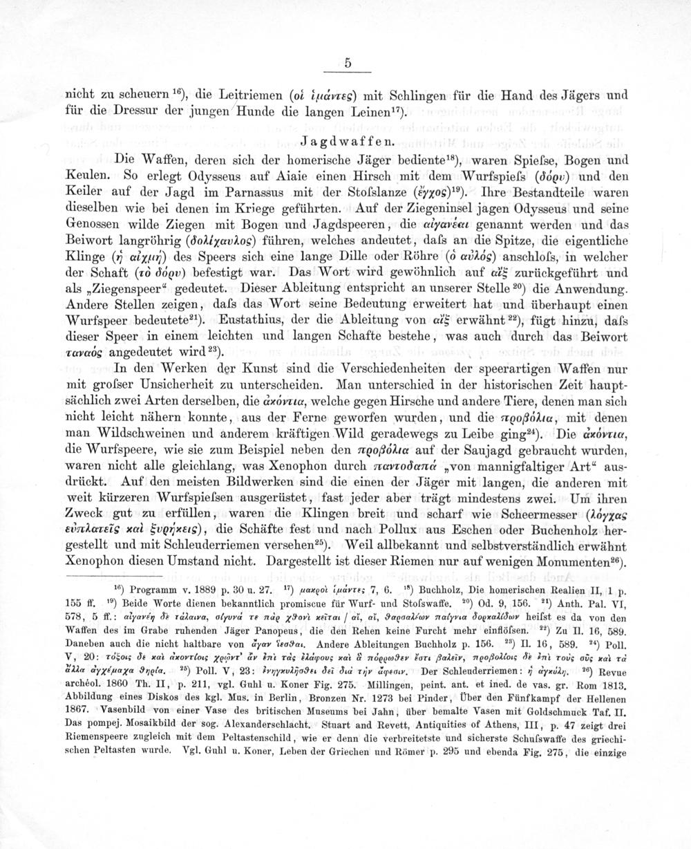 In den Werken der Kunst sind die Verschiedenheiten der speerartigen Waffen nur mit groſser Unsicherheit zu unterscheiden. Man unterschied in der historischen Zeit haupt- sächlich zwei Arten derselben, die deντνπνια, welche gegen Hirsche und andere Tiere, denen man sich nicht leicht nähern konnte, aus der Ferne geworfen wurden, und die rια, mit denen man Wildschweinen und anderem kräftigen Wild geradewegs zu Leibe ging²⁴). Die dævria, die Wurfspeere, wie sie zum Beispiel neben den Fr0056 11œ auf der Saujagd gebraucht wurden, waren nicht alle gleichlang, was Xenophon durch œαπeπτοdæmoσπσ„von mannigfaltiger Art“ aus- drückt. Auf den meisten Bildwerken sind die einen der Jäger mit langen, die anderen mit weit kürzeren Wurfspieſsen ausgerüstet, fast jeder aber trägt mindestens zwei. Um ihren Zweck gut zu erfüllen, waren die Klingen breit und scharf wie Scheermesser(16„xas edmdœες ᷣ νοινάκαιςε), die Schäfte fest und nach Pollux aus Eschen oder Buchenholz her- gestellt und mit Schleuderriemen versehen²⁵). Weil allbekannt und selbstverständlich erwähnt Xenophon diesen Umstand nicht. Dargestellt ist dieser Riemen nur auf wenigen Monumentene).