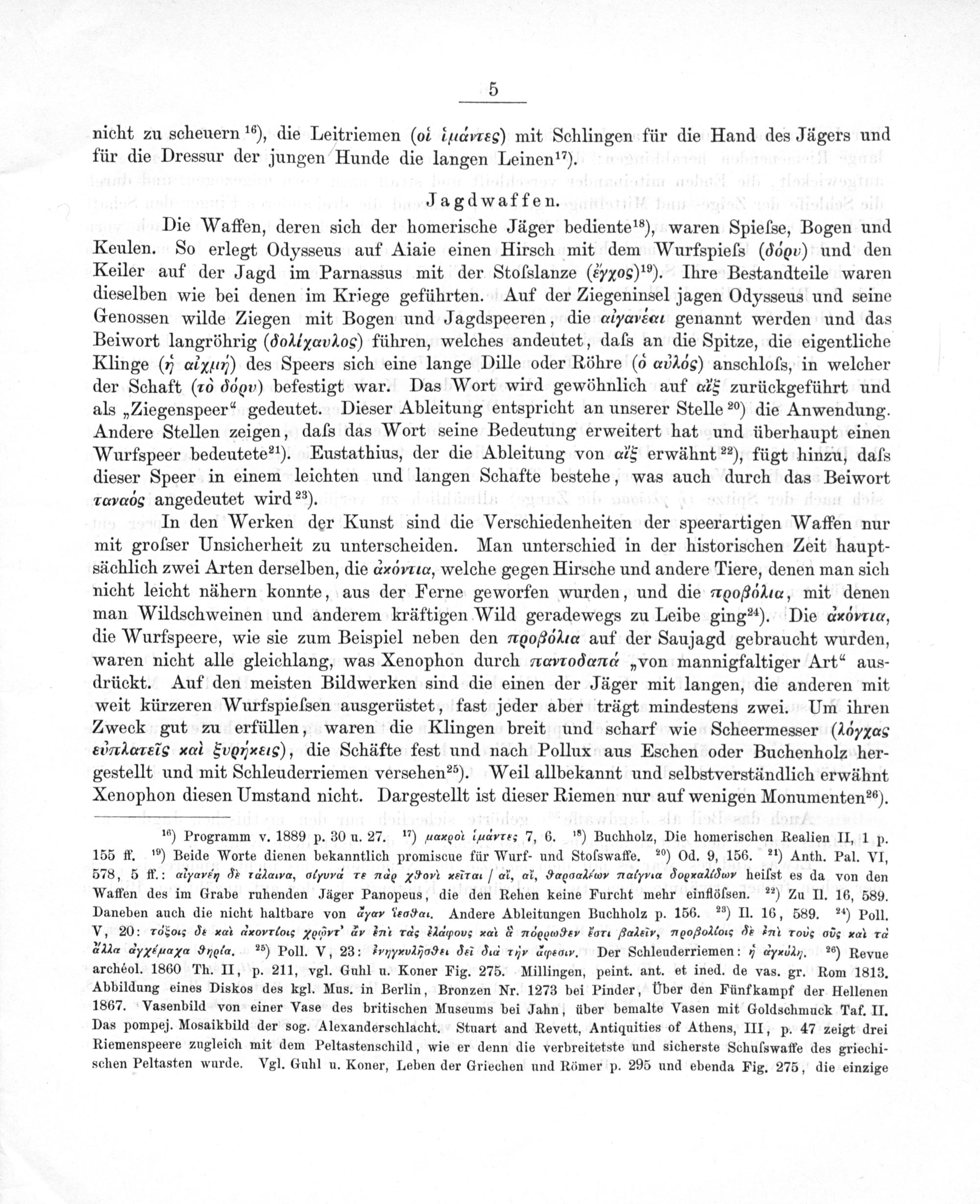 Die Waffen, deren sich der homerische Jäger bediente¹s), waren Spieſse, Bogen und Keulen. So erlegt Odysseus auf Aiaie einen Hirsch mit dem Wurfspieſs(ddou) und den Keiler auf der Jagd im Parnassus mit der Stoſslanze(yxο) ¹⁵). Ihre Bestandteile waren dieselben wie bei denen im Kriege geführten. Auf der Ziegeninsel jagen Odysseus und seine Genossen wilde Ziegen mit Bogen und Jagdspeeren, die alyævéat genannt werden und das Beiwort langröhrig(doliνανσα⁴οε) führen, welches andeutet, daſs an die Spitze, die eigentliche Klinge(j alεν) des Speers sich eine lange Dille oder Röhre( α‿*ς) anschloſs, in welcher der Schaft(1 dον) befestigt war. Das Wort wird gewöhnlich auf als zurückgeführt und als„Ziegenspeer“ gedeutet. Dieser Ableitung entspricht an unserer Stelle ²⁰) die Anwendung. Andere Stellen zeigen, daſs das Wort seine Bedeutung erweitert hat und überhaupt einen Wurfspeer bedeutete²¹). Eustathius, der die Ableitung von ais erwähnt ²²), fügt hinzu, daſs dieser Speer in einem leichten und langen Schafte bestehe, was auch durch das Beiwort rayxòg angedeutet wird ²³).