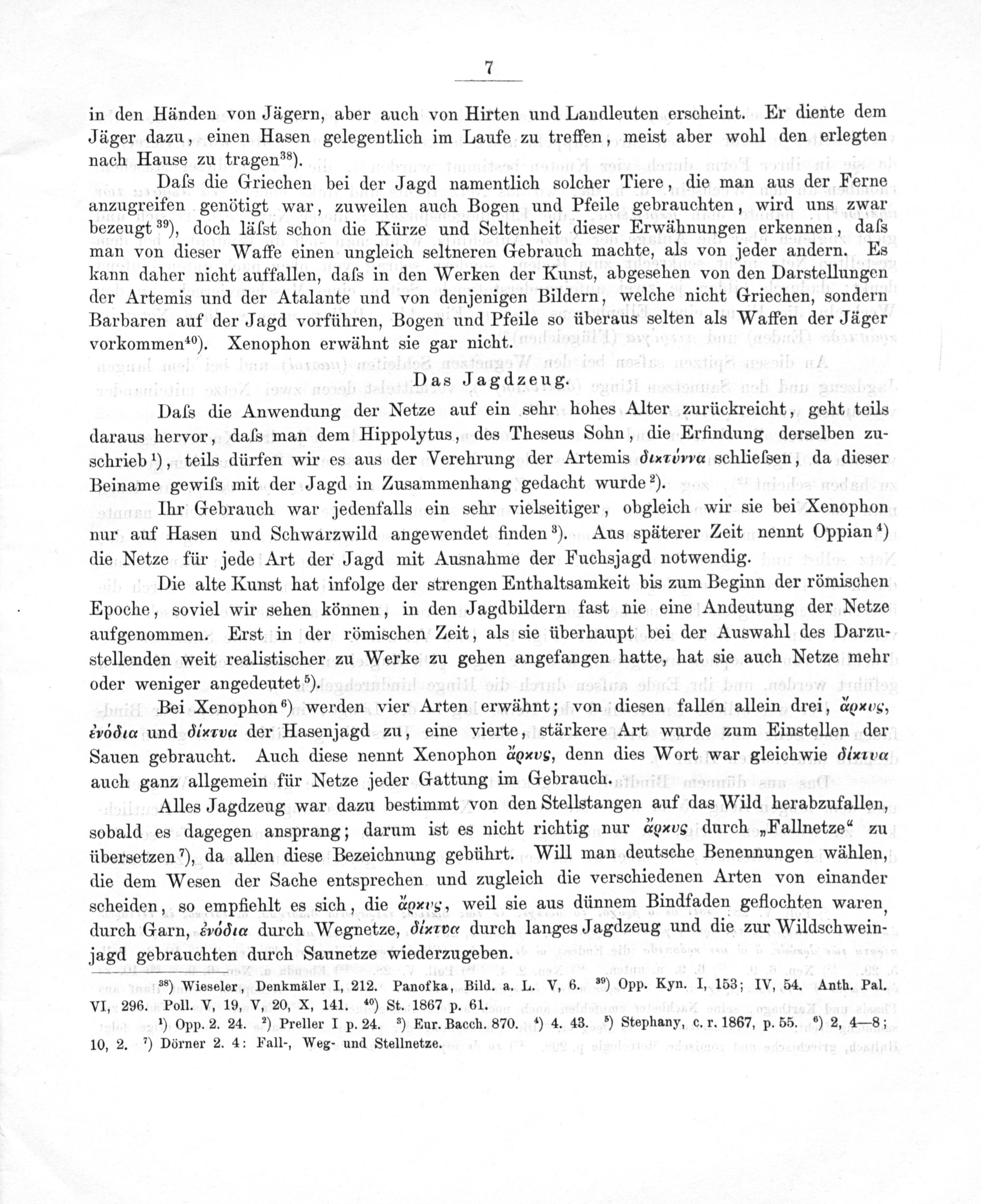 Daſs die Griechen bei der Jagd namentlich solcher Tiere, die man aus der Ferne anzugreifen genötigt war, zuweilen auch Bogen und Pfeile gebrauchten, wird uns zwar bezeugt ³⁹), doch läſst schon die Kürze und Seltenheit dieser Erwähnungen erkennen, daſs man von dieser Waffe einen ungleich seltneren Gebrauch machte, als von jeder andern. Es kann daher nicht auffallen, daſs in den Werken der Kunst, abgesehen von den Darstellungen der Artemis und der Atalante und von denjenigen Bildern, welche nicht Griechen, sondern Barbaren auf der Jagd vorführen, Bogen und Pfeile so überaus selten als Waffen der Jäger vorkommen¹¹²). Xenophon erwühnt sie gar nicht.