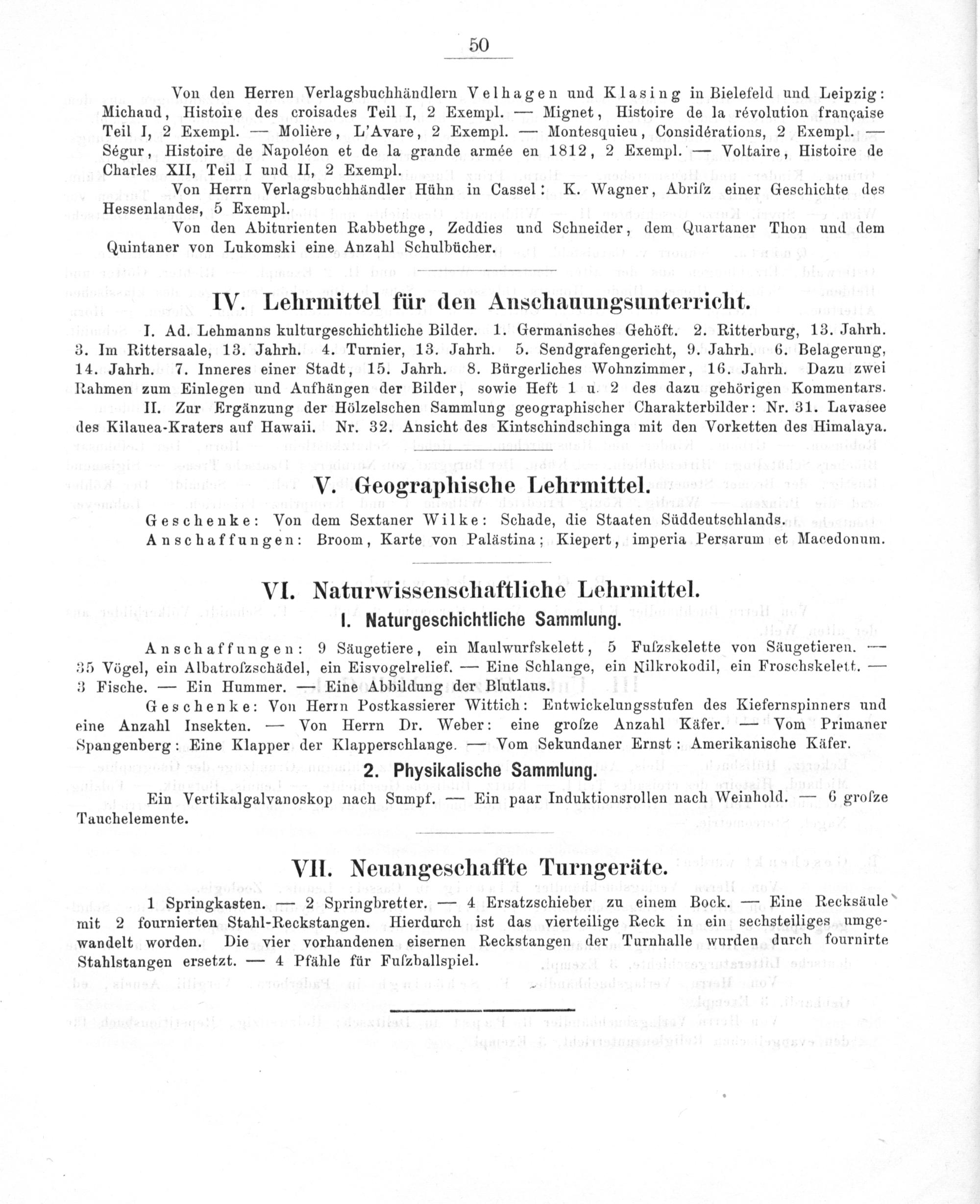 Geschenke: Von dem Sextaner Wilke: Schade, die Staaten Süddeutschlands. Anschaffungen: Broom, Karte von Palästina; Kiepert, imperia Persarum et Macedonum.
