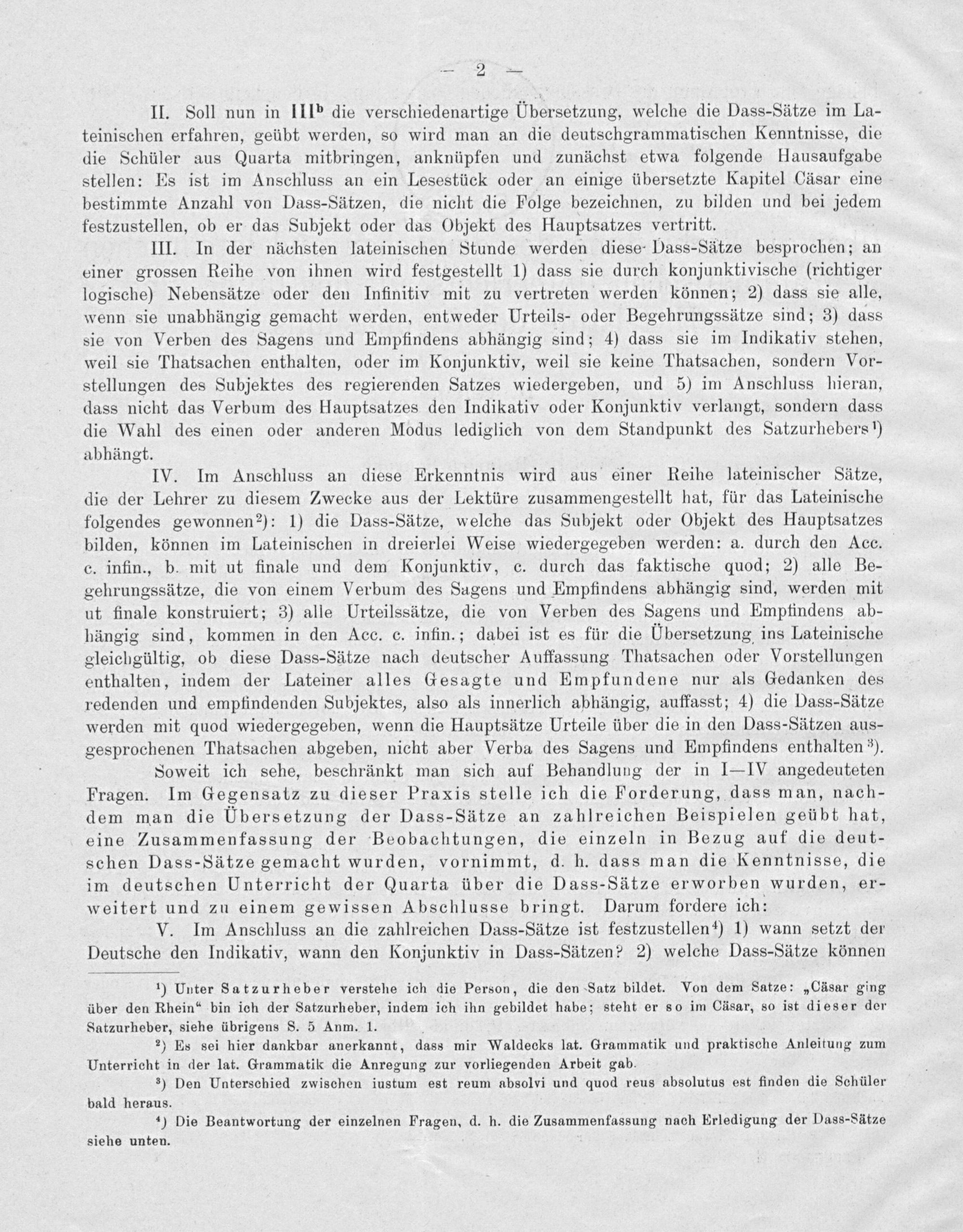Soweit ich sehe, beschränkt man sich auf Behandlung der in I—IV angedeuteten Fragen. Im Gegensatz zu dieser Praxis stelle ich die Forderung, dass man, nach- dem man die Übersetzung der Dass-Sätze an zahlreichen Beispielen geübt hat, eine Zusammenfassung der Beobachtungen, die einzeln in Bezug auf die deut- schen Dass-Sätze gemacht wurden, vornimmt, d. h. dass man die Kenntnisse, die im deutschen Unterricht der Quarta über die Dass-Sätze erworben wurden, er- weitert und zu einem gewissen Abschlusse bringt. Darum fordere ich: