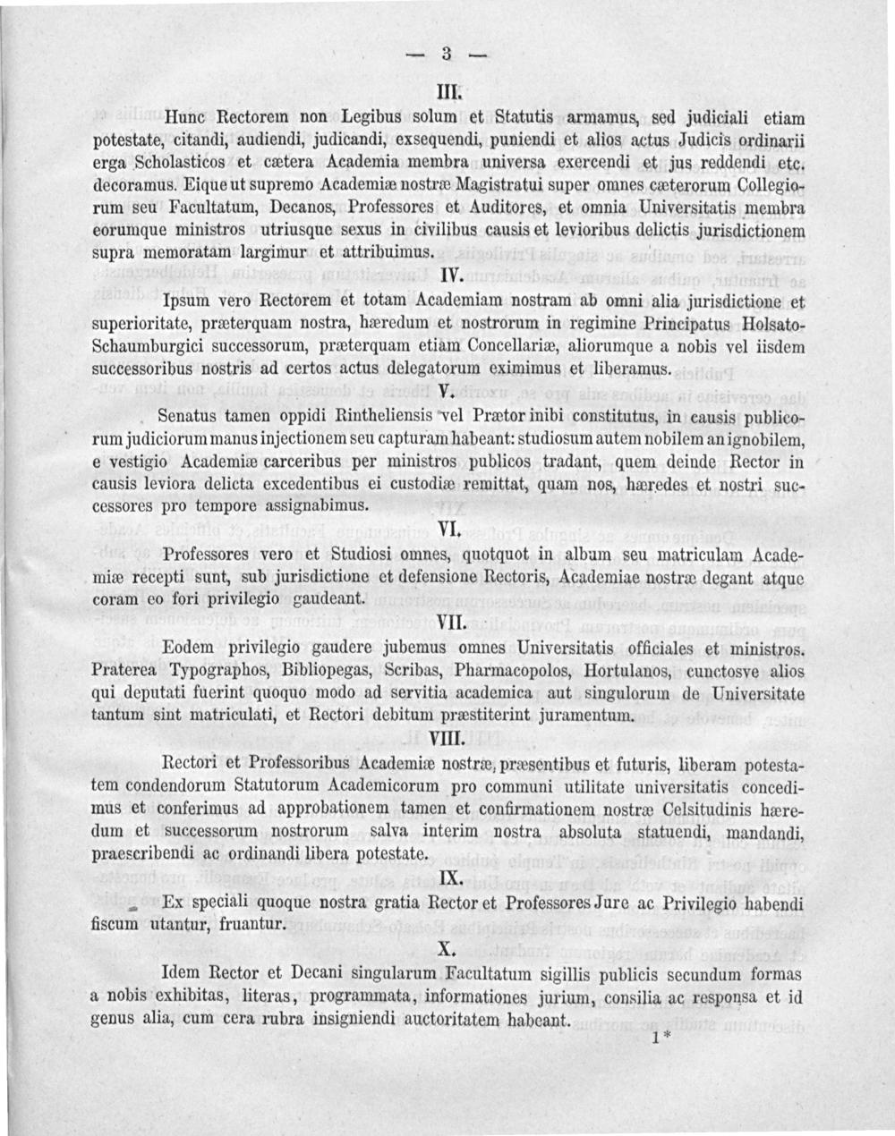 Ipsum vero Rectorem et totam Academiam nostram ab omni alia jurisdictione et superioritate, præterquam nostra, hæredum et nostrorum in regimine Principatus Holsato- Schaumburgici successorum, præeterquam etiam Concellariæ, aliorumque a nobis vel iisdem successoribus nostris ad certos actus delegatorum eximimus et liberamus.
