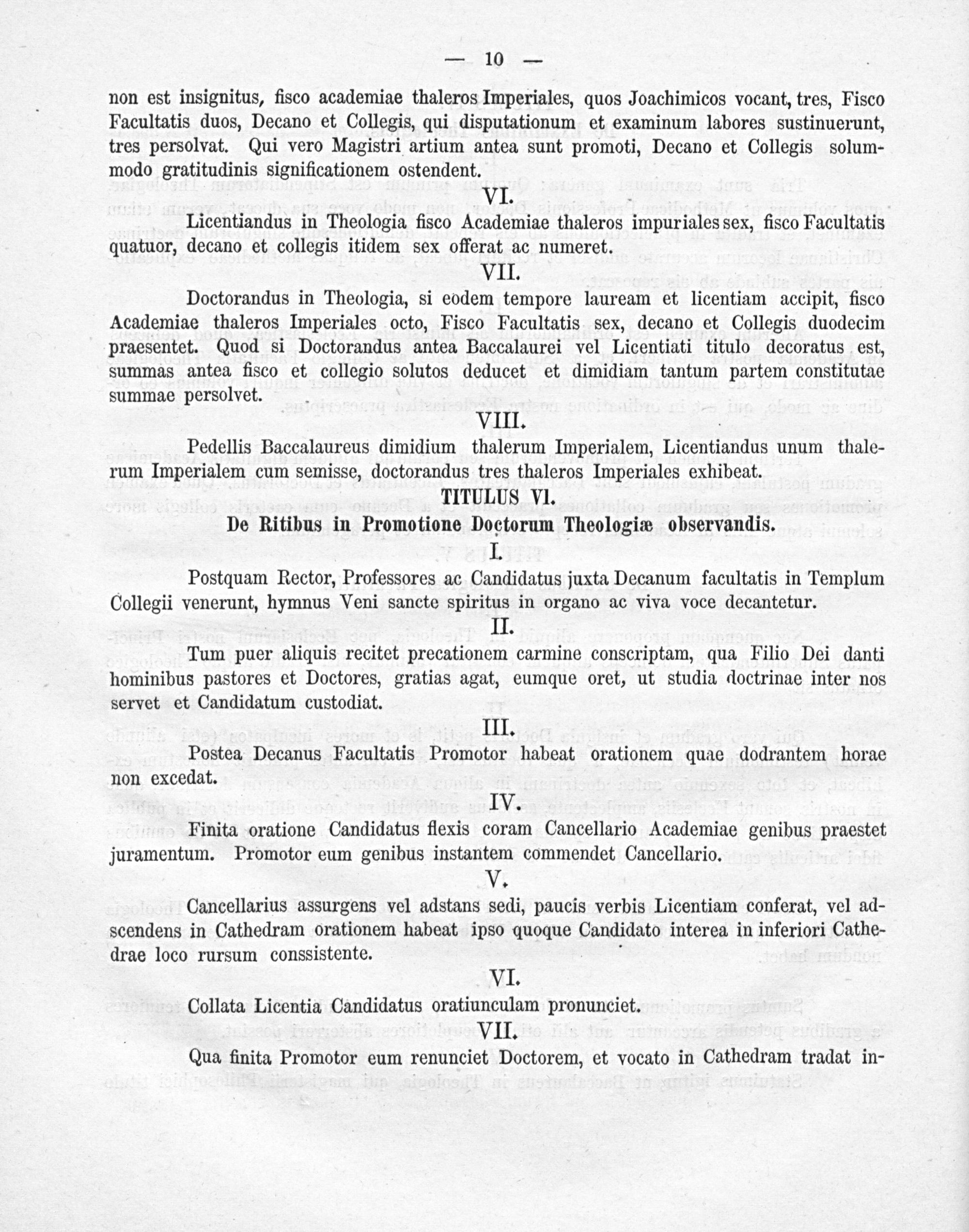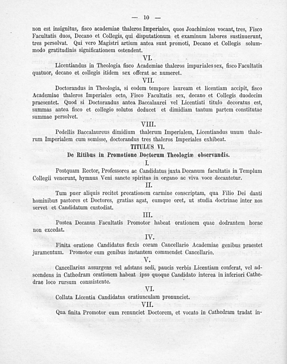 VIII. Pedellis Baccalaureus dimidium thalerum Imperialem, Licentiandus unum thale- rum Imperialem cum semisse, doctorandus tres thaleros Imperiales exhibeat. TITULUS VI. De Ritibus in Promotione Doctorum Theologiæ observandis. I