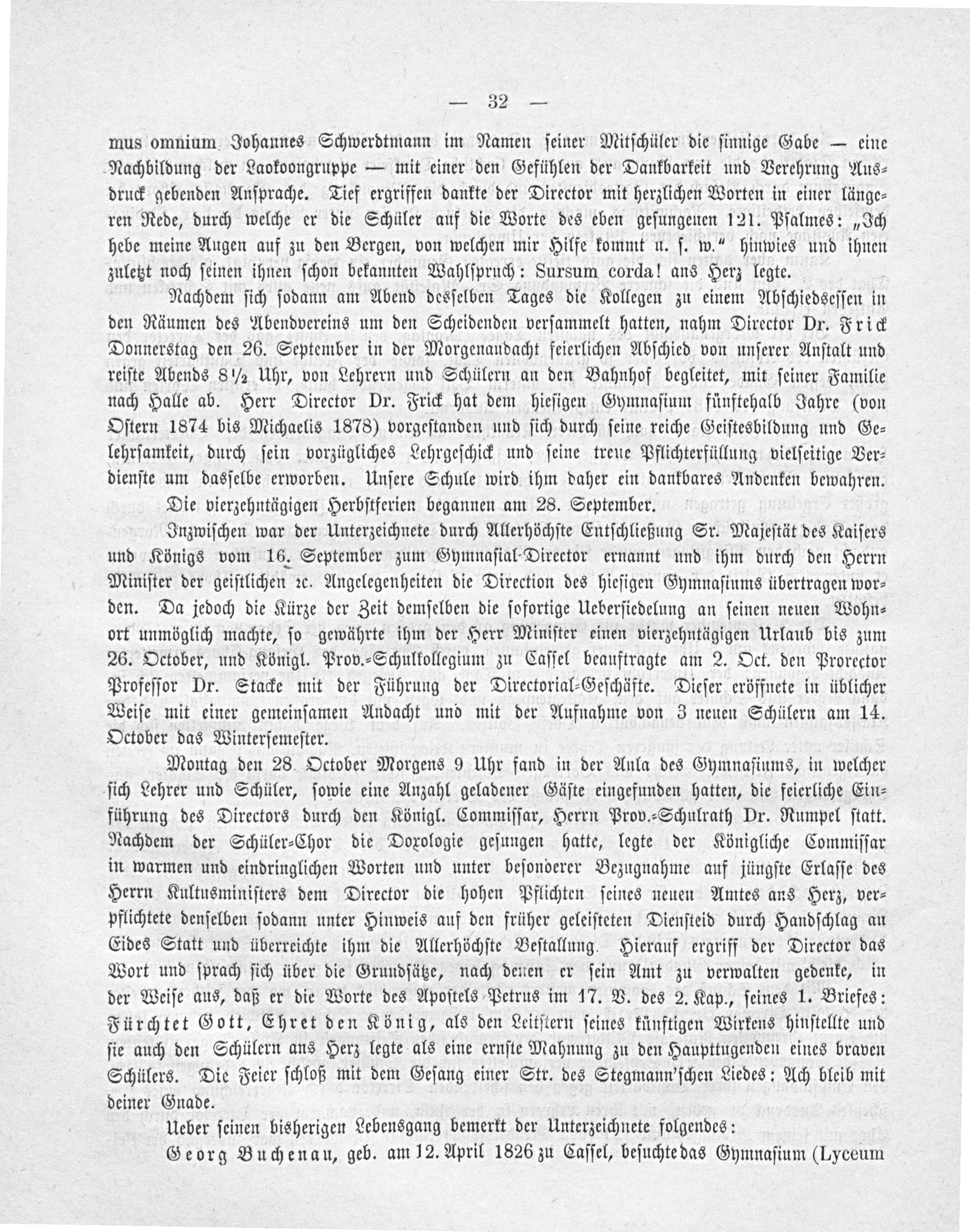 Nachdem ſich ſodann am Abend desſelben Tages die Kollegen zu einem Abſchiedseſſen in den Räumen des Abendvereins um den Scheidenden verſammelt hatten, nahm Director Dr. Frick Donnerstag den 26. September in der Morgenandacht feierlichen Abſchied von unſerer Anſtalt und reiſte Abends 8½ Uhr, von Lehrern und Schülern an den Bahnhof begleitet, mit ſeiner Familie nach Halle ab. Herr Director Dr. Frick hat dem hieſigen Gymnaſium fünftehalb Jahre(von Oſtern 1874 bis Michaelis 1878) vorgeſtanden und ſich durch ſeine reiche Geiſtesbildung und Ge⸗ lehrſamkeit, durch ſein vorzügliches Lehrgeſchick und ſeine treue Pflichterfüllung vielſeitige Ver⸗ dienſte um dasſelbe erworben. Unſere Schule wird ihm daher ein dankbares Andenken bewahren.