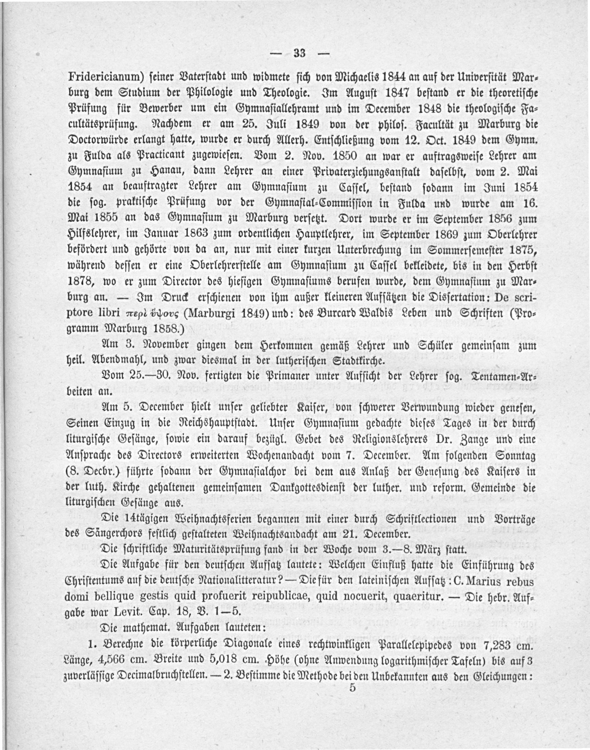 Fridericianum) ſeiner Vaterſtadt und widmete ſich von Michaelis 1844 an auf der Univerſität Mar⸗ burg dem Studium der Philologie und Theologie. Im Auguſt 1847 beſtand er die theoretiſche Prüfung für Bewerber um ein Gymnaſiallehramt und im December 1848 die theologiſche Fa⸗ cultätsprüfung. Nachdem er am 25. Juli 1849 von der philoſ. Facultät zu Marburg die Doctorwürde erlangt hatte, wurde er durch Allerh. Entſchließung vom 12. Oct. 1849 dem Gymn. zu Fulda als Practicant zugewieſen. Vom 2. Nov. 1850 an war er auftragsweiſe Lehrer am Gymnaſium zu Hanau, dann Lehrer an einer Privaterziehungsanſtalt daſelbſt, vom 2. Mai 1854 an beauftragter Lehrer am Gymnaſium zu Caſſel, beſtand ſodann im Juni 1854 die ſog. praktiſche Prüfung vor der Gymnaſial⸗Commiſſion in Fulda und wurde am 16. Mai 1855 an das Gymnaſium zu Marburg verſetzt. Dort wurde er im September 1856 zum Hilfslehrer, im Januar 1863 zum ordentlichen Hauptlehrer, im September 1869 zum Oberlehrer befördert und gehörte von da an, nur mit einer kurzen Unterbrechung im Sommerſemeſter 1875, während deſſen er eine Oberlehrerſtelle am Gymnaſium zu Caſſel bekleidete, bis in den Herbſt 1878, wo er zum Director des hieſigen Gymnaſiums berufen wurde, dem Gymnaſium zu Mar⸗ burg an.— Im Druck erſchienen von ihm außer kleineren Aufſätzen die Disſertation: De scri- ptore libri ept ⁸οusᷣ(Marburgi 1849) und: des Burcard Waldis Leben und Schriften(Pro⸗ gramm Marburg 1858.)