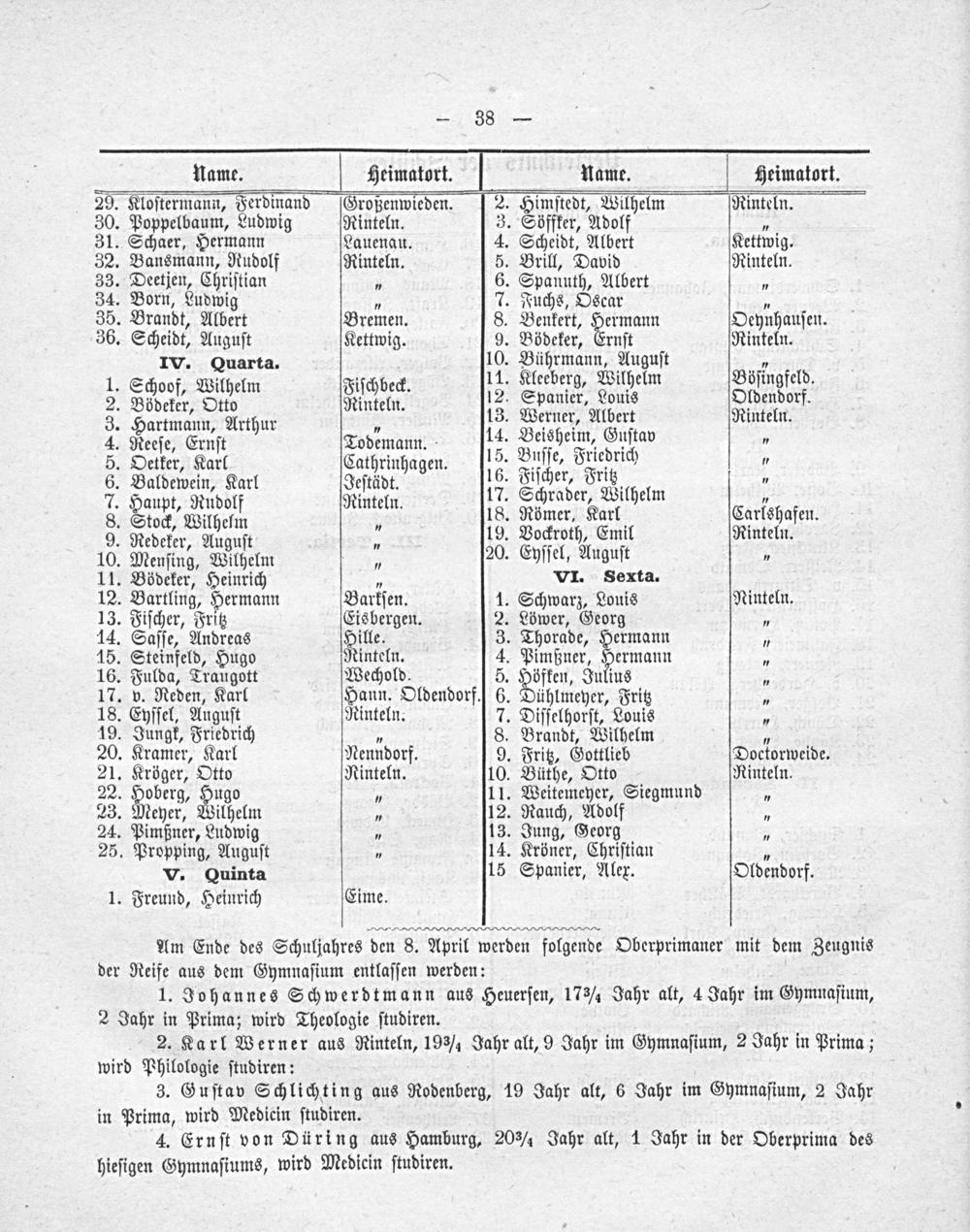 IV. Quarta. 10. Bühenanie. dani Bſfngfel 1. S Naj iſchbeck. 11. eeberg, Wilhelm ingfeld. 2. Swife, Wiheln Fiſchbeck 12. Spanier, Louis Oldendorf. 3. Hartmann, Arthur 4 13. Werner, Albert Rinteln. 4. Reeſe, Ernſt Todemann. 14. Beisheim, Guſtav„ 5. Oetker, Karl Cathrinhagen. 15. Buſſe, Friedrich 6. Baldewein, Karl Jeſtädt. 16. Fiſcher, Fritz 7. Haupt, Rudolf Rinteln. 17. Schrader, Wilhelm„ 8. Stock, Wilhelm„ 18. Römer, Karl Carlshafen. 9. Redeker, Auguſt„ 19. Vockroth, Emil Rinteln. 10. Menſing, Wilhelm„ 20. Eyſſel, Auguſt„ 11. Bödeker, Heinrich„ VI. Sexta. 12. Bartling, Hermann Barkſen. 1. Schwarz, Louis Ninteln. 13. Fiſcher, Fritz Eisbergen. 2. Löwer, Georg 9 14. Saſſe, Andreas Hille. 3. Thorade, Hermann„ 15. Steinfeld, Hugo Rinteln. 4. Pimßner, Hermann„ 16. Fulda, Traugott Wechold. 5. Höfken, Julius„ 17. v. Reden, Karl Hann. Oldendorf.] 6. Dühlmeyer, Fritz. 18. Eyſſel, Auguſt Rinteln. 7. Diſſelhorſt, Louis„ 19. Jungk, Friedrich„ 8. Brandt, Wilhelm„ 20. Kramer, Karl Nenndorf. 9. Fritz, Gottlieb Doctorweide. 21. Kröger, Otto Ninteln. 10. Büthe, Otto Rinteln. 22. Hoberg, Hugo„ 11. Weitemeyer, Siegmund„ 23. Meyer, Wilhelm„ 12. Rauch, Adolf„ 24. Pimßner, Ludwig„ 13. Jung, Georg„ 25. Propping, Auguſt„ 14. Kröner, Chriſtian„