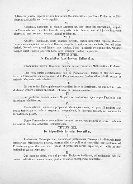 Porro Ceremonias et solemnitates actuum promotiones retineri et servari volumus usitatas in finitima Academia Helmstadiensi. TITULUS XIX. De Stipendiatis Privatim Docentibus. J.