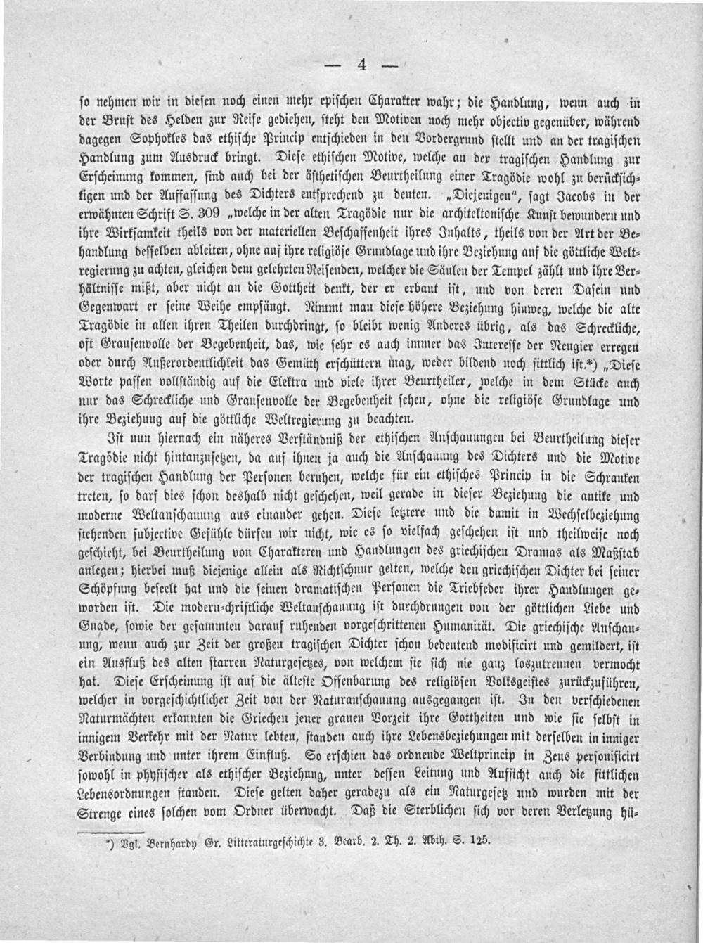 ſo nehmen wir in dieſen noch einen mehr epiſchen Charakter wahr; die Handlung, wenn auch in der Bruſt des Helden zur Reife gediehen, ſteht den Motiven noch mehr objectiv gegenüber, während dagegen Sophokles das ethiſche Princip entſchieden in den Vordergrund ſtellt und an der tragiſchen Handlung zum Ausdruck bringt. Dieſe ethiſchen Motive, welche an der tragiſchen Handlung zur Erſcheinung kommen, ſind auch bei der äſthetiſchen Beurtheilung einer Tragödie wohl zu berückſich⸗ figen und der Auffaſſung des Dichters entſprechend zu deuten.„Diejenigen“, ſagt Jacobs in der erwähnten Schrift S. 309„welche in der alten Tragödie nur die architektoniſche Kunſt bewundern und ihre Wirkſamkeit theils von der materiellen Beſchaffenheit ihres Inhalts, theils von der Art der Be⸗ handlung deſſelben ableiten, ohne auf ihre religiöſe Grundlage und ihre Beziehung auf die göttliche Welt⸗ regierung zu achten, gleichen dem gelehrten Reiſenden, welcher die Säulen der Tempel zählt und ihre Ver⸗ hältniſſe mißt, aber nicht an die Gottheit denkt, der er erbaut iſt, und von deren Daſein und Gegenwart er ſeine Weihe empfängt. Nimmt man dieſe höhere Beziehung hiuweg, welche die alte Tragödie in allen ihren Theilen durchdringt, ſo bleibt wenig Anderes übrig, als das Schreekliche, oft Grauſenvolle der Begebenheit, das, wie ſehr es auch immer das Intereſſe der Neugier erregen oder durch Außerordentlichkeit das Gemüth erſchüttern mag, weder bildend noch ſittlich iſt.*)„Dieſe Worte paſſen vollſtändig auf die Elektra und viele ihrer Beurtheiler, welche in dem Stücke auch nur das Schreckliche und Grauſenvolle der Begebenheit ſehen, ohne die religiöſe Grundlage und ihre Beziehung auf die göttliche Weltregierung zu beachten.