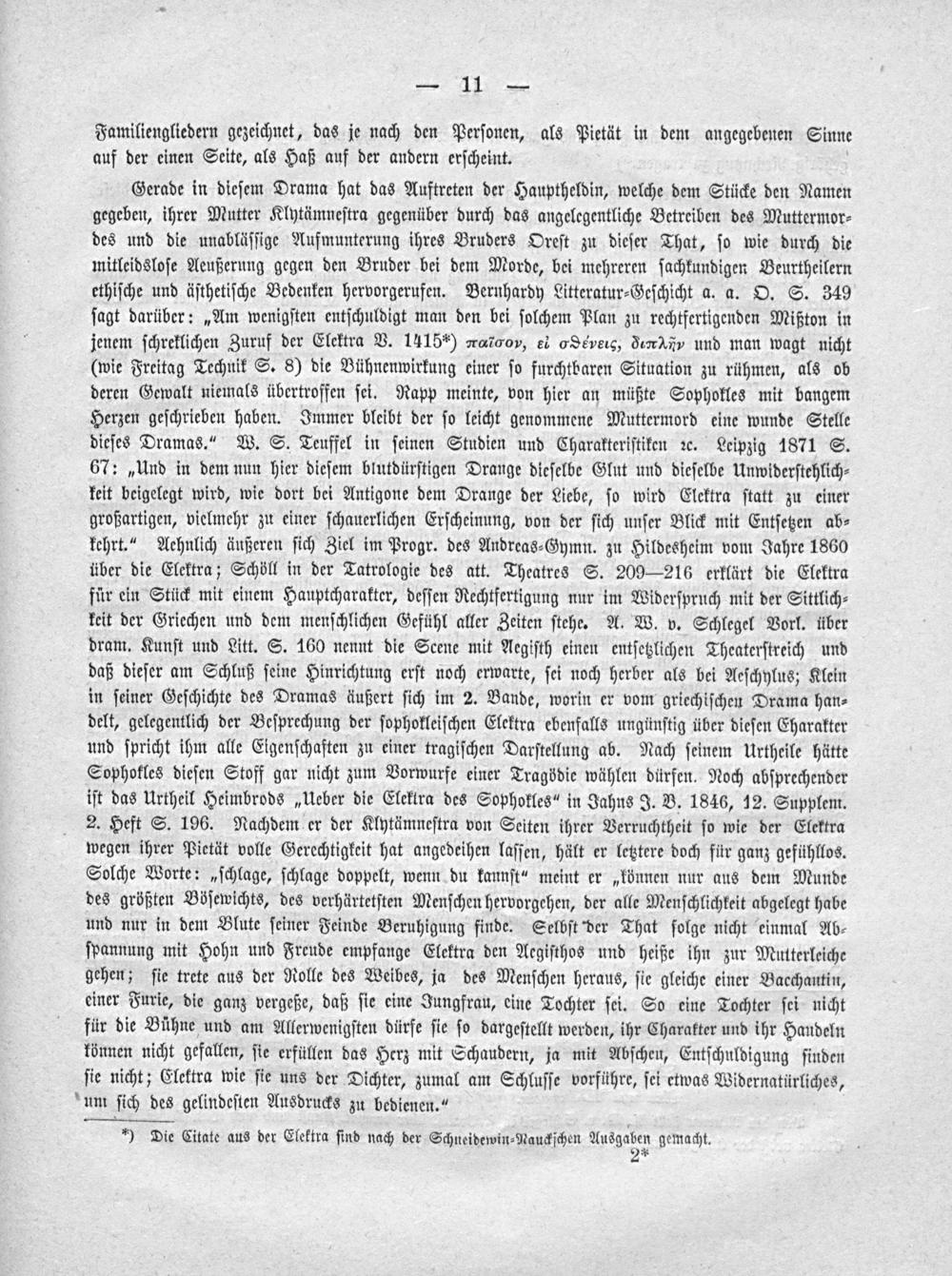 Gerade in dieſem Drama hat das Auftreten der Hauptheldin, welche dem Stücke den Namen gegeben, ihrer Mutter Klytämneſtra gegenüber durch das angelegentliche Betreiben des Muttermor⸗ des und die unabläſſige Aufmunterung ihres Bruders Oreſt zu dieſer That, ſo wie durch die mitleidsloſe Aeußerung gegen den Bruder bei dem Morde, bei mehreren ſachkundigen Beurtheilern ethiſche und äſthetiſche Bedenken hervorgerufen. Bernhardy Litteratur⸗Geſchicht a. a. O. S. 349 ſagt darüber:„Am wenigſten entſchuldigt man den bei ſolchem Plan zu rechtfertigenden Mißton in jenem ſchreklichen Zuruf der Elektra V. 1415*) rarαν, el Séveis, RrNX und man wagt nicht (wie Freitag Technik S. 8) die Bühnenwirkung einer ſo furchtbaren Situation zu rühmen, als ob deren Gewalt niemals übertroffen ſei. Rapp meinte, von hier an müßte Sophokles mit bangem Herzen geſchrieben haben. Immer bleibt der ſo leicht genommene Muttermord eine wunde Stelle dieſes Dramas.“ W. S. Teuffel in ſeinen Studien und Charakteriſtiken ꝛc. Leipzig 1871 S. 67:„Und in dem nun hier dieſem blutdürſtigen Drange dieſelbe Glut und dieſelbe Unwiderſtehlich⸗ keit beigelegt wird, wie dort bei Antigone dem Drange der Liebe, ſo wird Elektra ſtatt zu einer großartigen, vielmehr zu einer ſchauerlichen Erſcheinung, von der ſich unſer Blick mit Entſetzen ab⸗ kehrt.“ Aehnlich äußeren ſich Ziel im Progr. des Andreas⸗Gymn. zu Hildesheim vom Jahre 1860 über die Elektra; Schöll in der Tatrologie des att. Theatres S. 209— 216 erklärt die Elektra für ein Stück mit einem Hauptcharakter, deſſen Rechtfertigung nur im Widerſpruch mit der Sittlich⸗ keit der Griechen und dem menſchlichen Gefühl aller Zeiten ſtehe. A. W. v. Schlegel Vorl. über dram. Kunſt und Litt. S. 160 nennt die Scene mit Aegiſth einen entſetzlichen Theaterſtreich und daß dieſer am Schluß ſeine Hinrichtung erſt noch erwarte, ſei noch herber als bei Aeſchylus; Klein in ſeiner Geſchichte des Dramas äußert ſich im 2. Bande, worin er vom griechiſchen Drama han⸗ delt, gelegentlich der Beſprechung der ſophokleiſchen Elektra ebenfalls ungünſtig über dieſen Eharakter und ſpricht ihm alle Eigenſchaften zu einer tragiſchen Darſtellung ab. Nach ſeinem Urtheile hätte Sophokles dieſen Stoff gar nicht zum Vorwurfe einer Tragödie wählen dürfen. Noch abſprechender iſt das Urtheil Heimbrods„Ueber die Elektra des Sophokles“ in Jahns J. B. 1846, 12. Supplem. 2. Heft S. 196. Nachdem er der Klytämneſtra von Seiten ihrer Verruchtheit ſo wie der Elektra wegen ihrer Pietät volle Gerechtigkeit hat angedeihen laſſen, hält er letztere doch für ganz gefühllos. Solche Worte:„ſchlage, ſchlage doppelt, wenn du kannſt“ meint er„können nur aus dem Munde des größten Böſewichts, des verhärtetſten Menſchen hervorgehen, der alle Menſchlichkeit abgelegt habe und nur in dem Blute ſeiner Feinde Beruhigung finde. Selbſt der That ſolge nicht einmal Ab⸗ ſpannung mit Hohn und Freude empfange Elektra den Aegiſthos und heiße ihn zur Mutterleiche gehen; ſie trete aus der Rolle des Weibes, ja des Menſchen heraus, ſie gleiche einer Bacchantin, einer Furie, die ganz vergeße, daß ſie eine Jungfrau, eine Tochter ſei. So eine Tochter ſei nicht für die Bühne und am Allerwenigſten dürfe ſie ſo dargeſtellt werden, ihr Charakter und ihr Handeln können nicht gefallen, ſie erfüllen das Herz mit Schaudern, ja mit Abſcheu, Entſchuldigung ſinden ſie nicht; Elektra wie ſie uns der Dichter, zumal am Schluſſe vorführe, ſei etwas Widernatürliches,