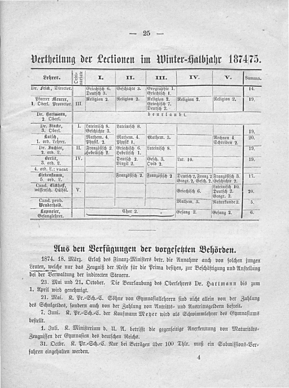 gehrer. 3 3 I. 4 II. III. IV. V. Summa. 2 Dr. Frick, Director. Griechiſch 6. Geſchichte 3.(Geographie 1. 14. Deutſch 3. Griechiſch 1.— Pfarrer Meurer, Religion 2. Religion 2. Religion 2. Religion 2. Religion 2. 19. I. Oberl. Prorector.] III. Griechiſch 7. Deutſch 2. Dr. Hartmann, beurlaubt. 2. Oberl. Dr. Stache, I. Lateiniſch 8. Lateiniſch 8. 3. Oberl. Geſchichte 3. 19. Kutſch, Mathem. 4. Mathem. 4. Mathem. 3. Rechnen 1. 20. 1. ord. Lehrer. Phyſik. 2. Phyſik 1. Schreiben 2.— Dr. Suchier, II. Franzöſiſch 2. Griechiſch 6. Lateiniſch 8. 19. 2. ord. L. Hebräiſch 2. Hebräiſch 1 Berlit, IV. Deutſch 2.(eſch. 3. Lat. 10. 19. 3. ord. L. Virgil 2. Ovid 2.——— 4. ord. L.: vacat— Birkenſtamm, Franzöſiſch 2. Franzoͤſiſch 2 Deutſch SSrnn 2 Franzöſiſch 3. 17. 5. ord. L. Geogr. 2, Geſch. 2. Geſchichte 2. Cand. Eickhoff, Lateiniſch 10. wiſſenſch. Hülfsl. V. Griechiſch 6. Deutſch 2. 20. — Geogr. 2. Cand. prob. Mathem. 3. Naturkunde 2. 5. wenderhold. — KAapmeier, Chor 2.. Geſang 2. Geſang 2. 6. Geſanglehrer.— 1