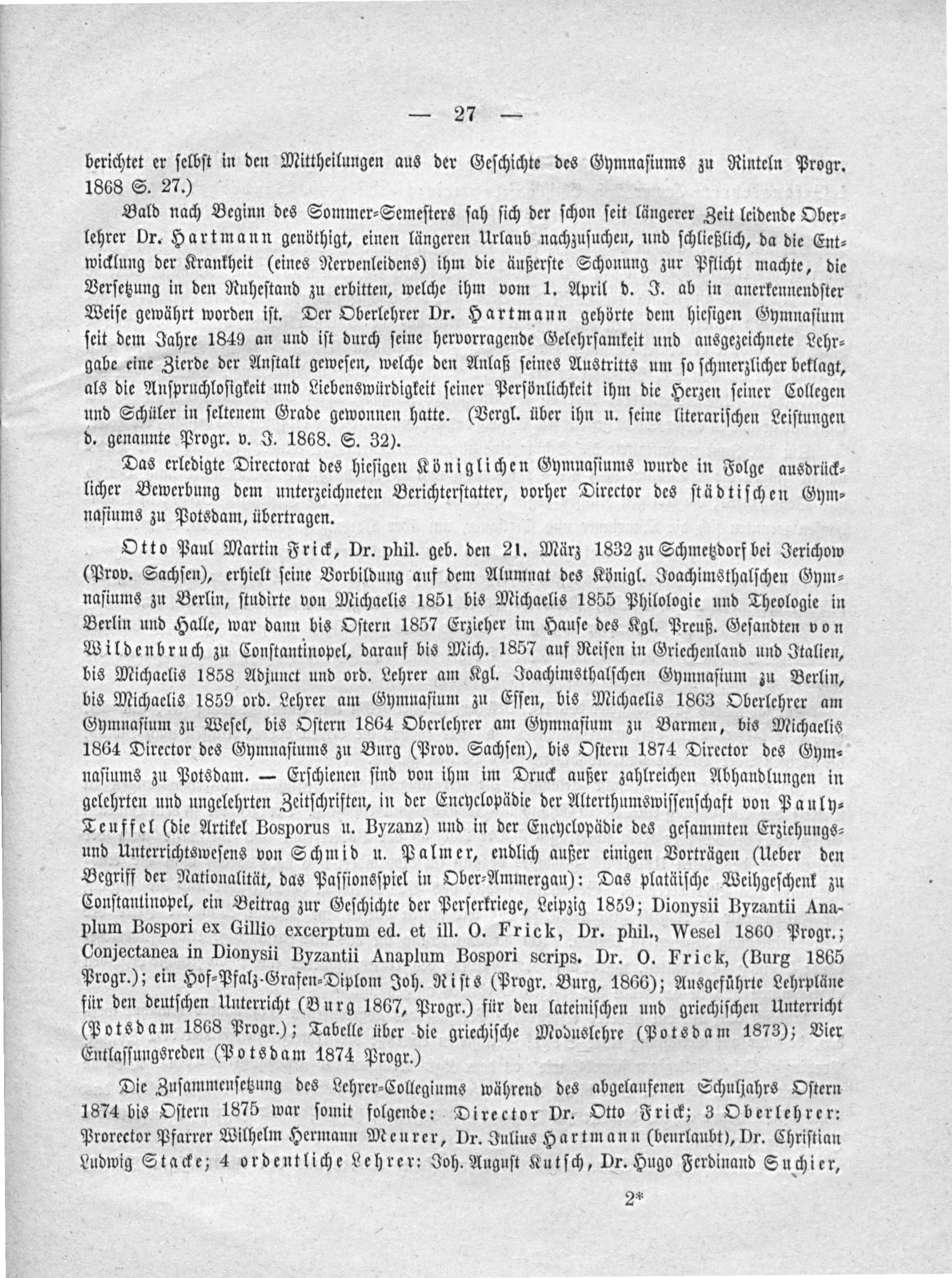Otto Paul Martin Frick, Dr. phil. geb. den 21. März 1832 zu Schmetzdorf bei Jerichow (Prov. Sachſen), erhielt ſeine Vorbildung auf dem Alumnat des Königl. Joachimsthalſchen Gym⸗ naſiums zu Berlin, ſtudirte von Michaelis 1851 bis Michaelis 1855 Philologie und Theologie in Berlin und Halle, war dann bis Oſtern 1857 Erzieher im Hauſe des Kgl. Preuß. Geſandten von Wildenbruch zu Conſtantinopel, darauf bis Mich. 1857 auf Reiſen in Griechenland und Italien, bis Michaelis 1858 Adjunct und ord. Lehrer am Kgl. Joachimsthalſchen Gymnaſium zu Berlin, bis Michaelis 1859 ord. Lehrer am Gymnaſium zu Eſſen, bis Michaelis 1863 Oberlehrer am Gymnaſium zu Weſel, bis Oſtern 1864 Oberlehrer am Gymnaſium zu Barmen, bis Michaelis 1864 Director des Gymnaſiums zu Burg(Prov. Sachſen), bis Oſtern 1874 Director des Gym⸗ naſiums zu Potsdam.— Erſchienen ſind von ihm im Druck außer zahlreichen Abhandlungen in gelehrten und ungelehrten Zeitſchriften, in der Encyclopädie der Alterthumswiſſenſchaft von Pauly⸗ Teuffel(die Artikel Bosporus u. Byzanz) und in der Encyclopädie des geſammten Erziehungs⸗ und Unterrichtsweſens von Schmid u. Palmer, endlich außer einigen Vorträgen(Ueber den Begriff der Nationalität, das Paſſionsſpiel in Ober⸗Ammergau): Das platäiſche Weihgeſchenk zu Conſtantinopel, ein Beitrag zur Geſchichte der Perſerkriege, Leipzig 1859; Dionysii Byzantii Ana- plum Bospori ex Gillio excerptum ed. et ill. O. Frick, Dr. phil., Wesel 1860 Progr.; Conjectanea in Dionysii Byzantii Anaplum Bospori scrips. Dr. O. Frick,(Burg 1865 Progr.); ein Hof⸗Pfalz⸗Grafen⸗Diplom Joh. Riſts(Progr. Burg, 1866); Ausgeführte Lehrpläne für den deutſchen Unterricht(Burg 1867, Progr.) für den lateiniſchen und griechiſchen Unterricht (Potsdam 1868 Progr.); Tabelle über die griechiſche Moduslehre(Potsdam 1873); Vier Entlaſſungsreden(Potsdam 1874 Progr.)
