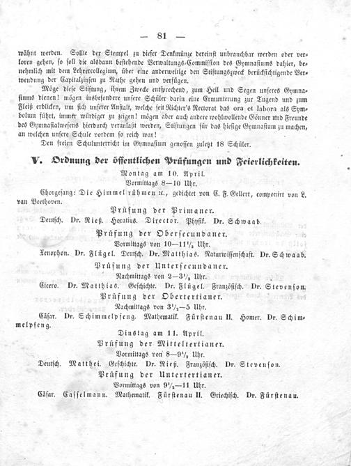 V. Ordnung der öffentlichen Prüfungen und Feierlichkeiten. Montag am 10. April. Vormittags 8— 10 Uhr.. Chorgeſang: Die Himmel rühmen tc., gedichtet von C. F. Gellert, componirt von L. van Beethoven. Prüfung der Primaner. Deutſch. Dr. Rieß. Horatius. Director. Phyſik. Dr. Schwaab.