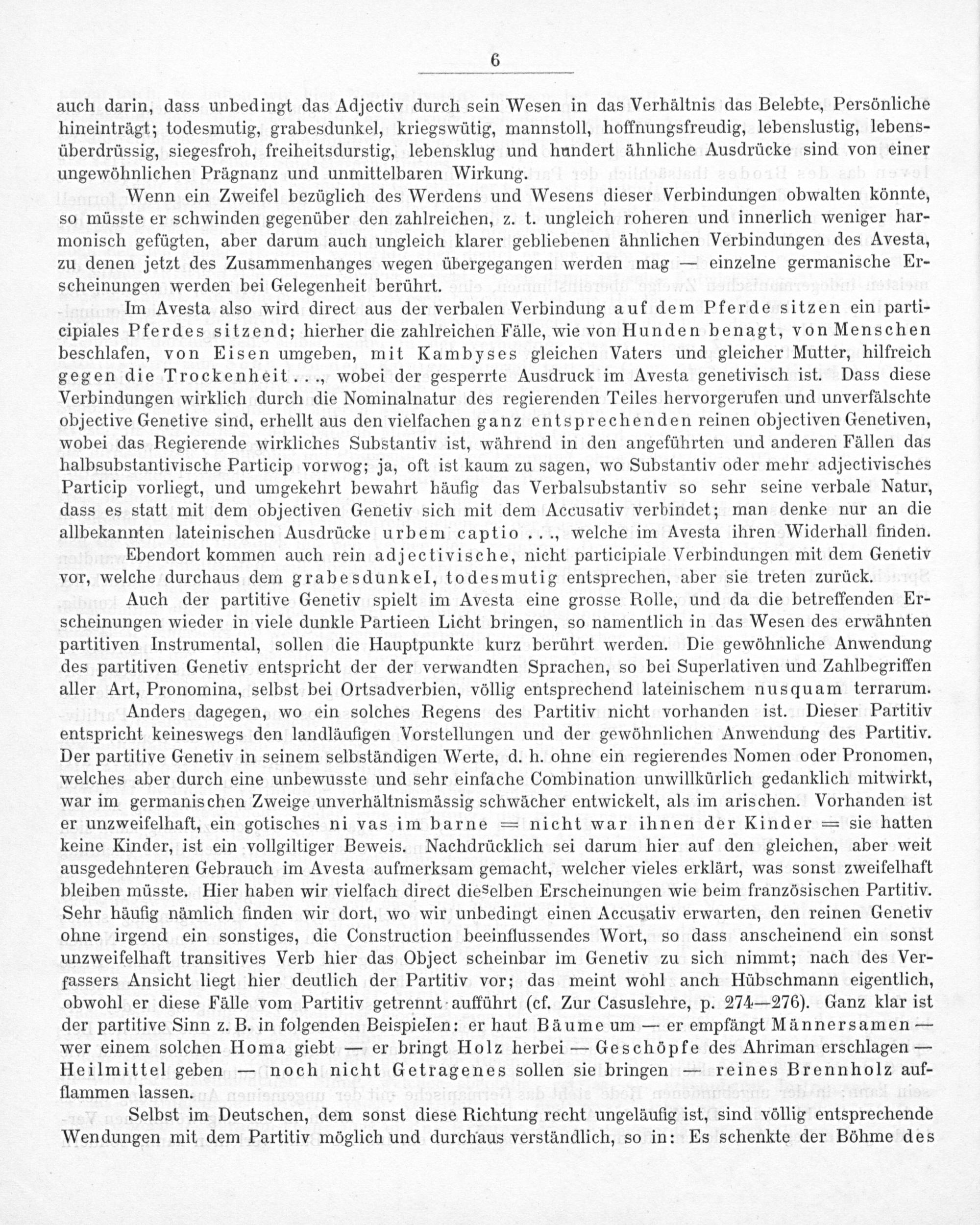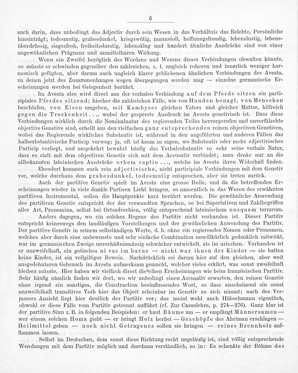 Im Avesta also wird direct aus der verbalen Verbindung auf dem Pferde sitzen ein parti- cipiales Pferdes sitzend; hierher die zahlreichen Fälle, wie von Hunden benagt, von Menschen beschlafen, von Eisen umgeben, mit Kambyses gleichen Vaters und gleicher Mutter, hilfreich gegen die Trockenheit..„ wobei der gesperrte Ausdruck im Avesta genetivisch ist. Dass diese Verbindungen wirklich durch die Nominalnatur des regierenden Teiles hervorgerufen und unverfälschte objective Genetive sind, erhellt aus den vielfachen ganz entsprechenden reinen objectiven Genetiven, wobei das Regierende wirkliches Substantiv ist, während in den angeführten und anderen Fällen das halbsubstantivische Particip vorwog; ja, oft ist kaum zu sagen, wo Substantiv oder mehr adjectivisches Particip vorliegt, und umgekehrt bewahrt häufig das Verbalsubstantiv so sehr seine verbale Natur, dass es statt mit dem objectiven Genetiv sich mit dem Accusativ verbindet; man denke nur an die allbekannten lateinischen Ausdrücke urbem captio..., welche im Avesta ihren Widerhall finden.