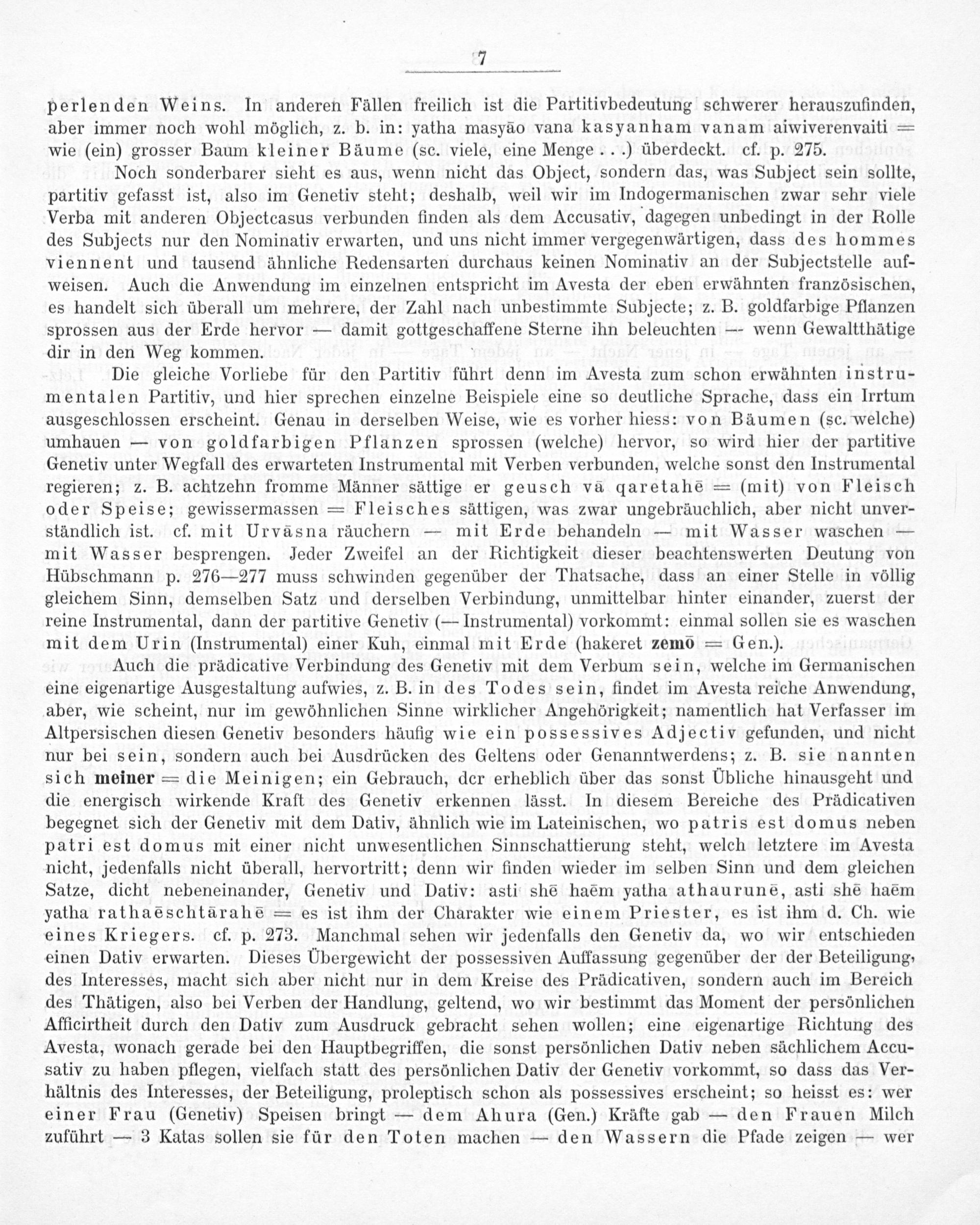 Noch sonderbarer sieht es aus, wenn nicht das Object, sondern das, was Subject sein sollte, partitiv gefasst ist, also im Genetiv steht; deshalb, weil wir im Indogermanischen zwar sehr viele Verba mit anderen Objectcasus verbunden finden als dem Accusativ, dagegen unbedingt in der Rolle des Subjects nur den Nominativ erwarten, und uns nicht immer vergegenwärtigen, dass des hommes viennent und tausend ähnliche Redensarten durchaus keinen Nominativ an der Subjectstelle auf- weisen. Auch die Anwendung im einzelnen entspricht im Avesta der eben erwähnten französischen, es handelt sich überall um mehrere, der Zahl nach unbestimmte Subjecte; z. B. goldfarbige Pflanzen sprossen aus der Erde hervor— damit gottgeschaffene Sterne ihn beleuchten— wenn Gewaltthätige dir in den Weg kommen.