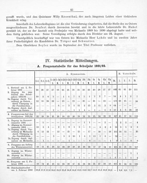A. Frequenztabelle für das Schuljahr 1891/92.