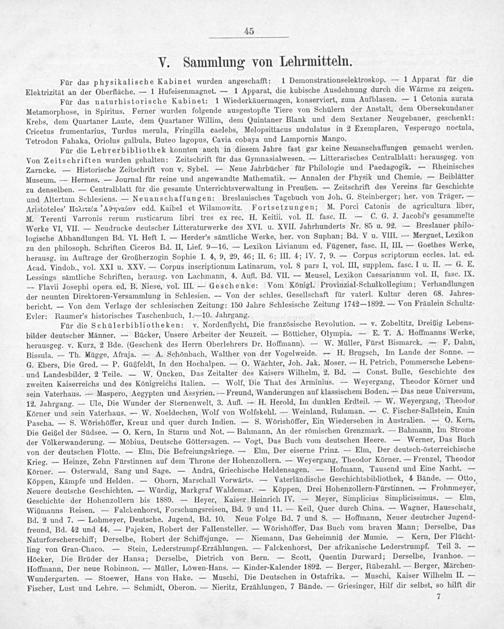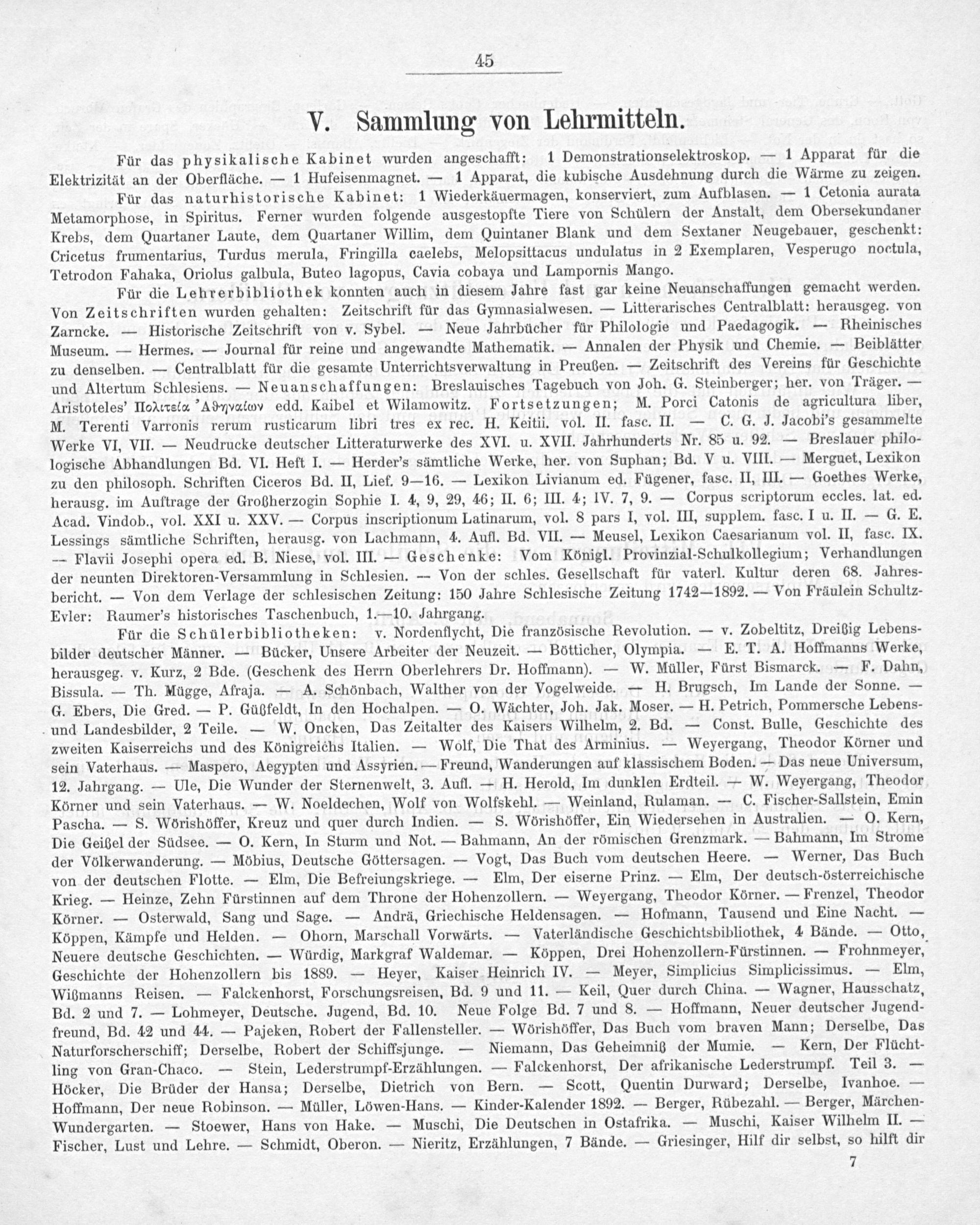 Für die Lehrerbibliothek konnten auch in diesem Jahre fast gar keine Neuanschaffungen gemacht werden. Von Zeitschriften wurden gehalten: Zeitschrift für das Gymnasialwesen.— Litterarisches Centralblatt: herausgeg. von Zarncke.— Historische Zeitschrift von v. Sybel.— Neue Jahrbücher für Philologie und Paedagogik.— Rheinisches Museum.— Hermes.— Journal für reine und angewandte Mathematik.— Annalen der Physik und Chemie.— Beiblätter zu denselben.— Centralblatt für die gesamte Unterrichtsverwaltung in Preußen.— Zeitschrift des Vereins für Geschichte und Altertum Schlesiens.— Neuanschaffungen: Breslauisches Tagebuch von Joh. G. Steinberger; her. von Träger.— Aristoteles' IIoxtretaæ Advatcy edd. Kaibel et Wilamowitz. Fortsetzungen; M. Porci Catonis de agricultura liber, M. Terenti Varronis rerum rusticarum libri tres ex rec. H. Keitii. vol. II. fasc. II.— C. G. J. Jacobi's gesammelte Werke VI, VII.— Neudrucke deutscher Litteraturwerke des XVI. u. XVII. Jahrhunderts Nr. 85 u. 92.— Breslauer philo- logische Abhandlungen Bd. VI. Heft I.— Herder's sämtliche Werke, her. von Suphan; Bd. V u. VIII.— Merguet, Lexikon zu den philosoph. Schriften Ciceros Bd. II, Lief. 9— 16.— Lexikon Livianum ed. Fügener, fasc. II, III.— Goethes Werke, herausg. im Auftrage der Großherzogin Sophie I. 4, 9, 29, 46; II. 6; III. 4; IV. 7, 9.— Corpus scriptorum eccles. lat. ed. Acad. Vindob., vol. XXI u. XXV.— Corpus inscriptionum Latinarum, vol. 8 pars I, vol. III, supplem. fasc. I u. II.— G. E. Lessings sämtliche Schriften, herausg. von Lachmann, 4. Aufl. Bd. VII.— Meusel, Lexikon Caesarianum vol. II, fasc. IX. — Flavii Josephi opera ed. B. Niese, vol. III.— Geschenke: Vom Königl. Provinzial-Schulkollegium; Verhandlungen der neunten Direktoren-Versammlung in Schlesien.— Von der schles. Gesellschaft für vaterl. Kultur deren 68. Jahres- bericht.— Von dem Verlage der schlesischen Zeitung: 150 Jahre Schlesische Zeitung 1742— 1892.— Von Fräulein Schultz- Evler: Raumer's historisches Taschenbuch, 1.—10. Jahrgang.