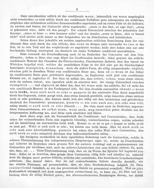 Ganz unverkennbar zeitlich ist das conditionale wenn, bekanntlich von wann ursprünglich nicht verschieden; es wird mithin durch das conditionale Verhältnis ganz naturgemäss ein wirkliches, möõgliches oder nichtwahres zeitliches Zusammentreffen angedeutet, und im ersten Falle ist der Indicativ, im zweiten und letzten der Coniunctiv allein angebracht:„wenn er das thut, so sage ihm“,„wenn er gekommen wäre, haätte ich ihm gesagt“. Der scharfe Unterschied zwischen der potentialen Auf- fassung:„wenn er käme= etwa kommen sollte“ und der irrealen„wenn er käme, aber er kommt nicht“ wird hierbei nicht immer so klar festgehalten wie im Griechischen und Lateinischen.