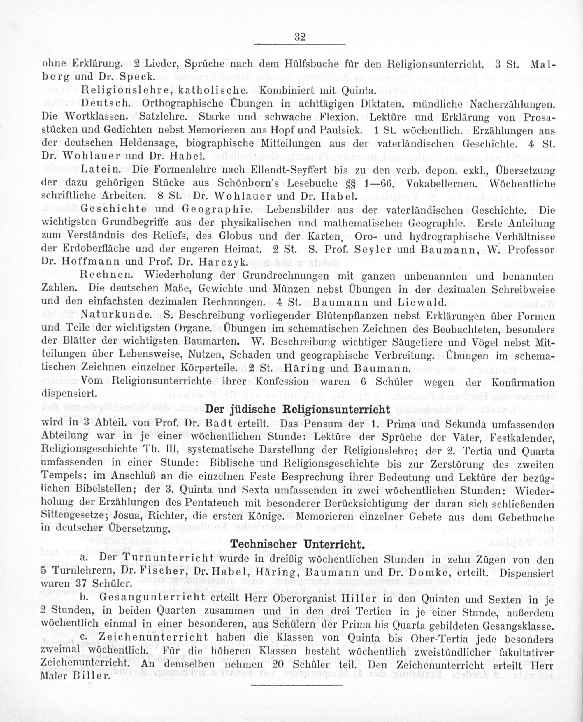 b. Gesangunterricht erteilt Herr Oberorganist Hiller in den Quinten und Sexten in je 2 Stunden, in beiden Quarten zusammen und in den drei Tertien in je einer Stunde, außerdem wöchentlich einmal in einer besonderen, aus Schülern der Prima bis Quarta gebildeten Gesangsklasse.
