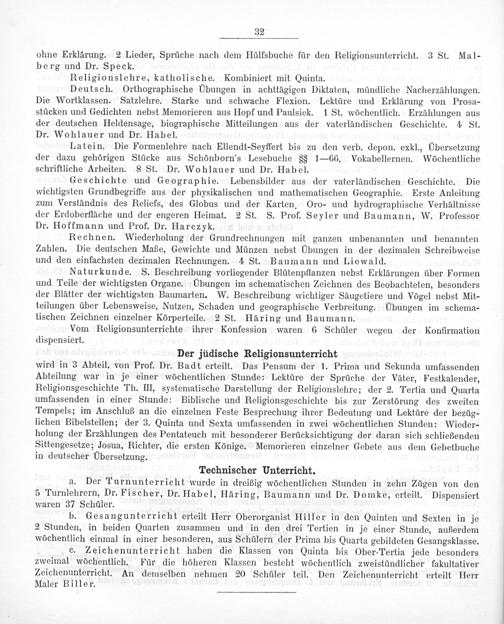 a. Der Turnunterricht wurde in dreißig wöchentlichen Stunden in zehn Zügen von den 5 Turnlehrern, Dr. Fischer, Dr. Habel, Häring, Baumann und Dr. Domke, erteilt. Dispensiert waren 37 Schüler.