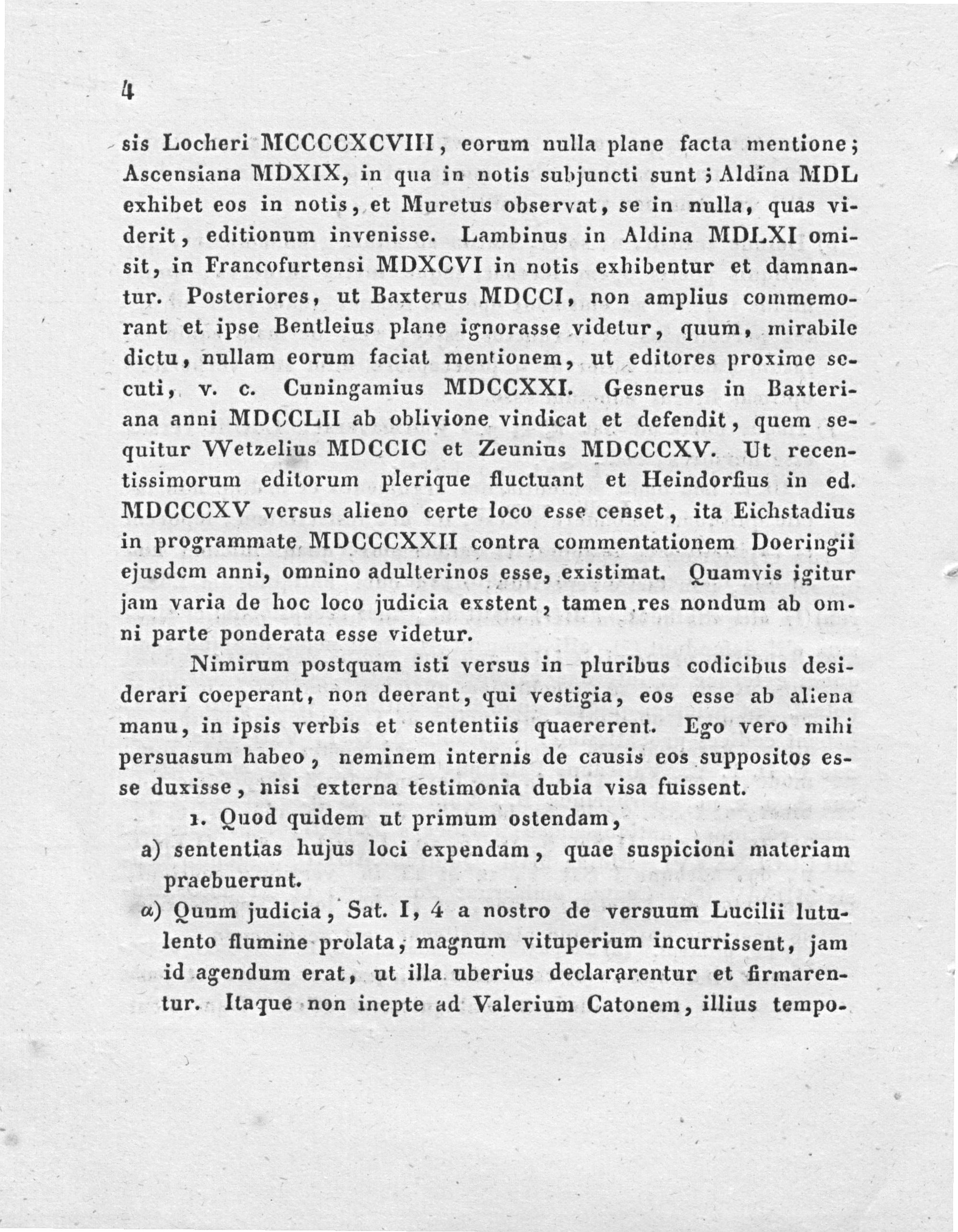 sis Locheri MCCCCXCVIII, eorum nulla plane facta mentione; Ascensiana MDXIX, in qua in notis subjuncti sunt;3 Aldina MDI. exhibet eos in notis, et Muretus observat, se in nulla, quas vi- derit, editionum invenisse. Lambinus in Aldina MDLXI omi- sit, in Francofurtensi MDXCVI in notis exhibentur et damnan- tur. Posteriores, ut Baxterus MDCCI, non amplius commemo- rant et ipse Bentleius plane ignorasse videtur, quum, mirabile dictu, nullam eorum faciat mentionem, ut editores proxime se- cuti, v. c. Cuningamius MDCCXXI. Gesnerus in Baxteri- ana anni MDCCLII ab oblivione vindicat et defendit, quem se- quitur Wetzelius MDCClC et Zeunius MD CCCXV. Ut recen- tissimorum editorum plerique fluctuant et Heindorfius in ed. MDCCCXV versus alieno certe loco esse censet, ita Eichstadius in programmate MDCCCXXII contra commentationem Doeringii ejusdom anni, omnino adulterinos esse, existimat. Quamyvis igitur jam varia de hoc loco judicia exstent, tamen res nondum ab om- ni parte ponderata esse videtur.