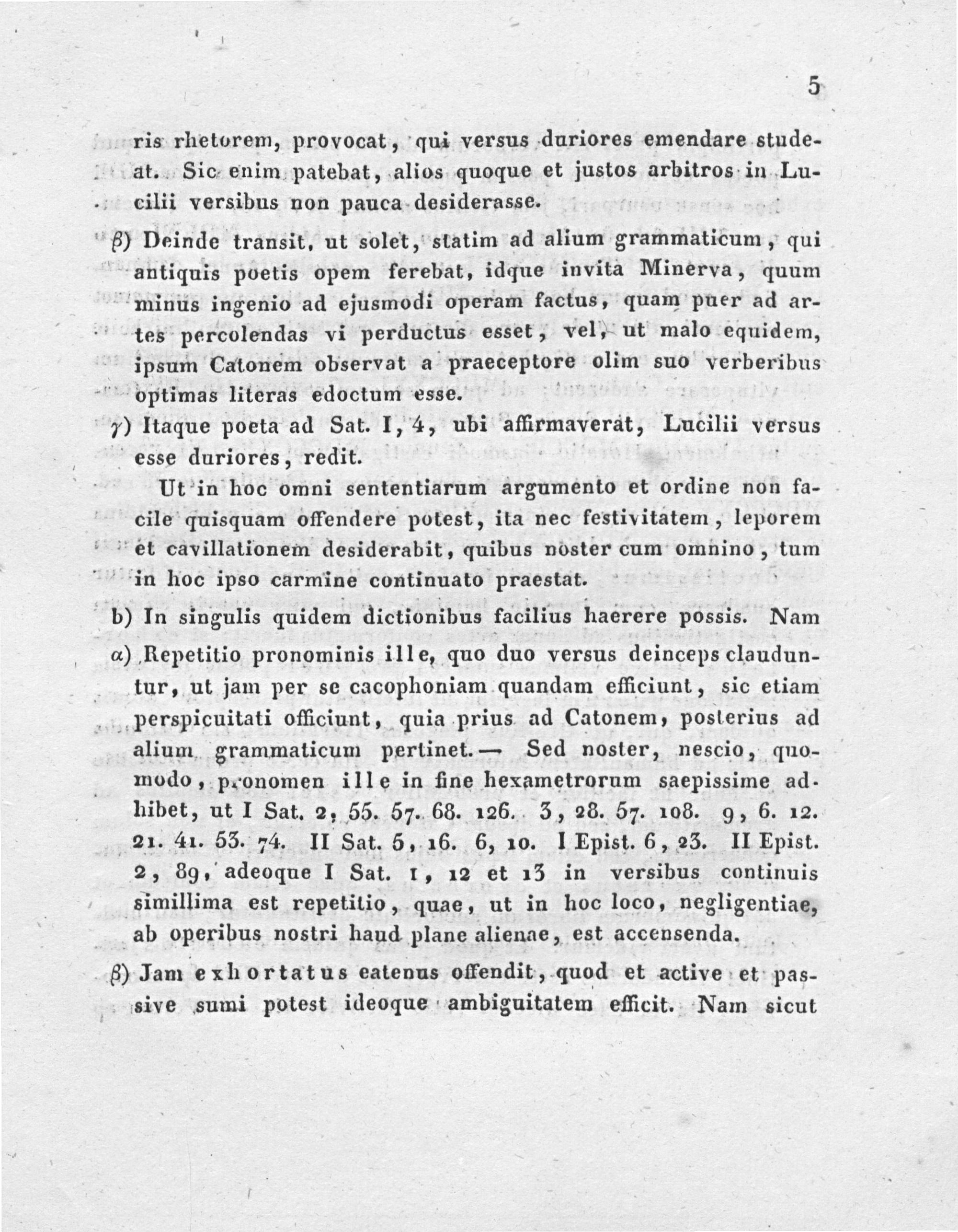 tes percolendas vi perductus esset, vel, ut malo equidem, ipsum Catonem observat a Praeceptore olim suo verberibus optimas literas edoctum esse.—. p) Itaque poeta ad Sat. I, 4, ubi affirmaverat, Lucilii versus esse duriores, redit. Ut'in hoc omni sententiarum argumento et ordine non fa- cile quisquam offendere potest, ita nec festivitatem, leporem det cavillationem desiderabit, quibus noster cum omnino, tum in hoc ipso carmine continuato praestat.— b) In singulis quidem dictionibus facilius haerere possis. Nam