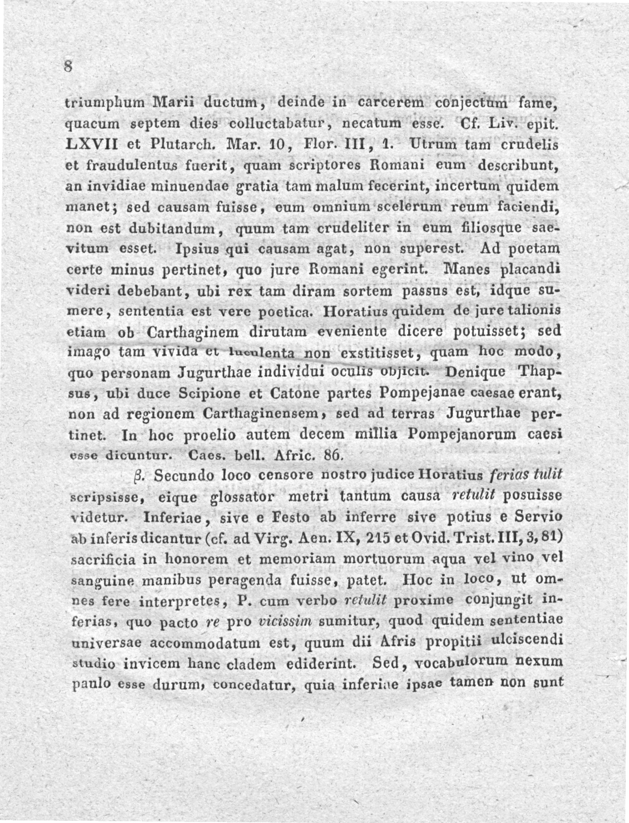triumphum Marii ductum, deinde in carcerem conjectum fame, quacum septem dies colluctabatur, necatum esse. Cf. Liv. epit. LXVII et Plutarch. Mar. 10, Flor. III, 1. Utrum tam crudelis et fraudulentus fuerit, quam scriptores Romani eum describunt, an invidiae minuendae gratia tam malum fecerint, incertum quidem manet; sed causam fuisse, eum omnium scelerum reum faciendi, non est dubitandum, quum tam crudeliter in eum flliosque sae- vitum esset. Ipsius qui causam agat, non superest. Ad poetam certe minus pertinet, quo jure Romani egerint. Manes placandi videri debebant, ubi rex tam diram sortem passus est, idque su- mere, sententia est vere poetica. Horatius quidem de jure talionis etiam ob Carthaginem dirutam eveniente dicere potuisset; sed imago tam Virida er lueulenta non exstitisset, quam hoc modo, quo personam Jugurthae individui oculis objictt. Denique Thap- sus, ubi duce Scipione et Catone partes Pompejanae caesae erant, non ad regionem Carthaginensem, sed ad terras Jugurthae per- tinet. In hoc proelio autem decem millia Pompejanorum caesi esse dicuntur. Caes. bell. Afric. 86.