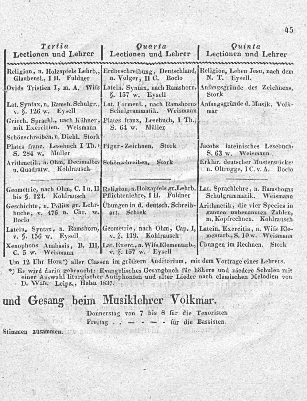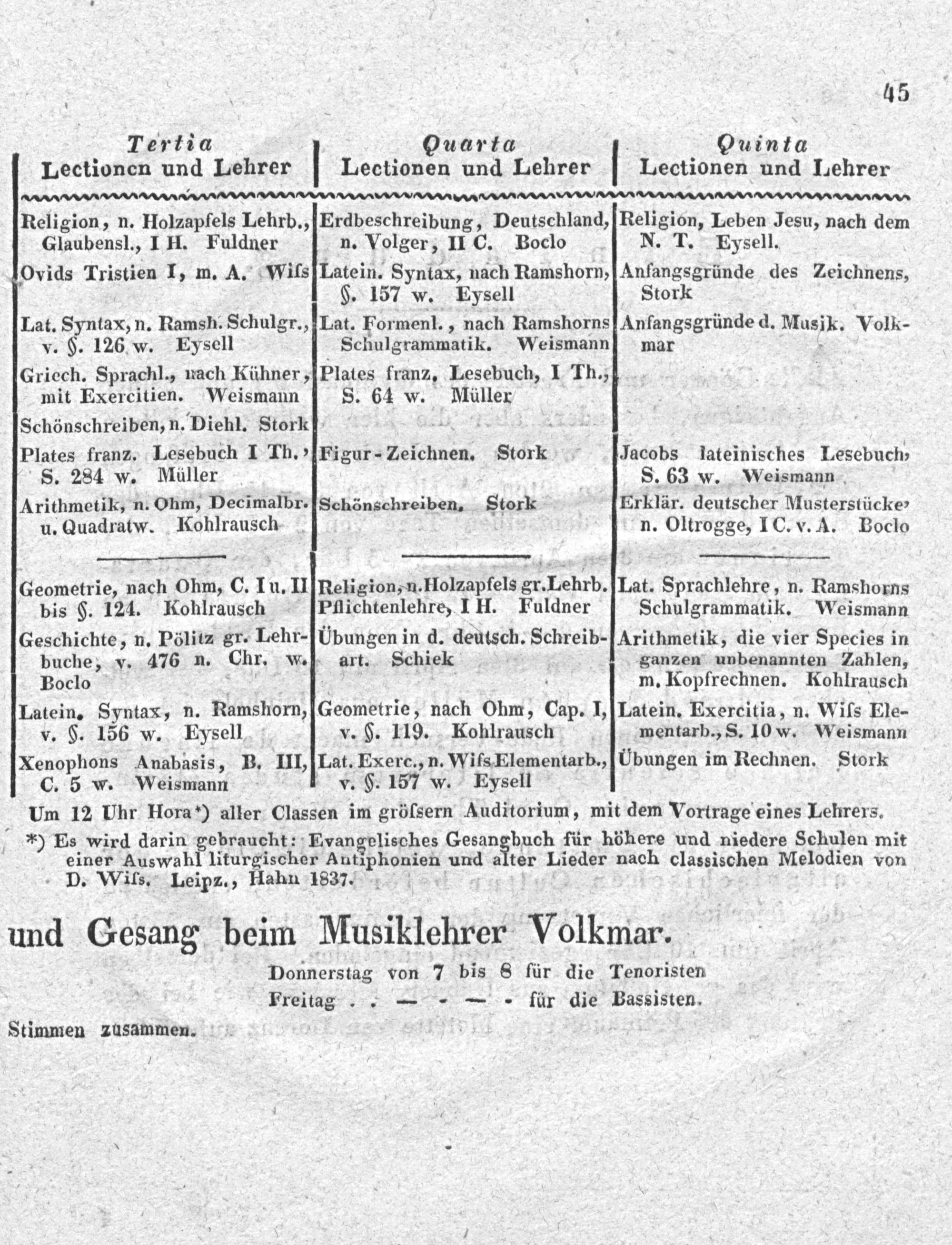Lat. Sprachlehre, n. Ramshorns Schulgrammatik. Weismann Arithmetik, die vier Species in ganzen unbenannten Zahlen, m. Kopfrechnen. Kohlrausch
