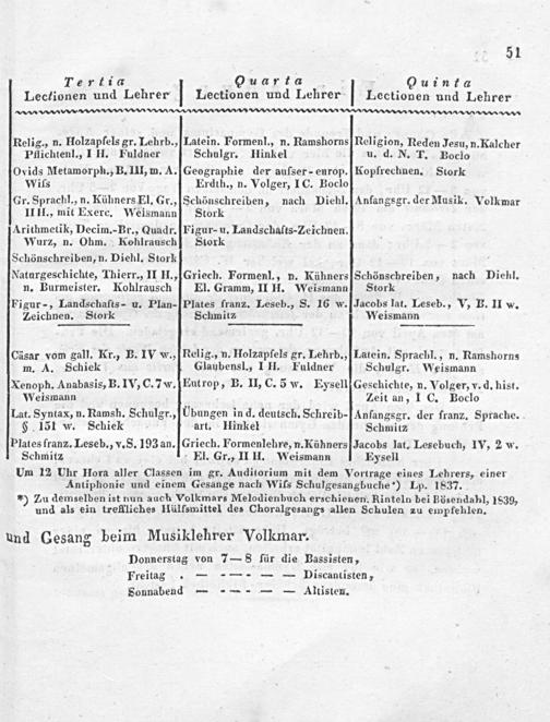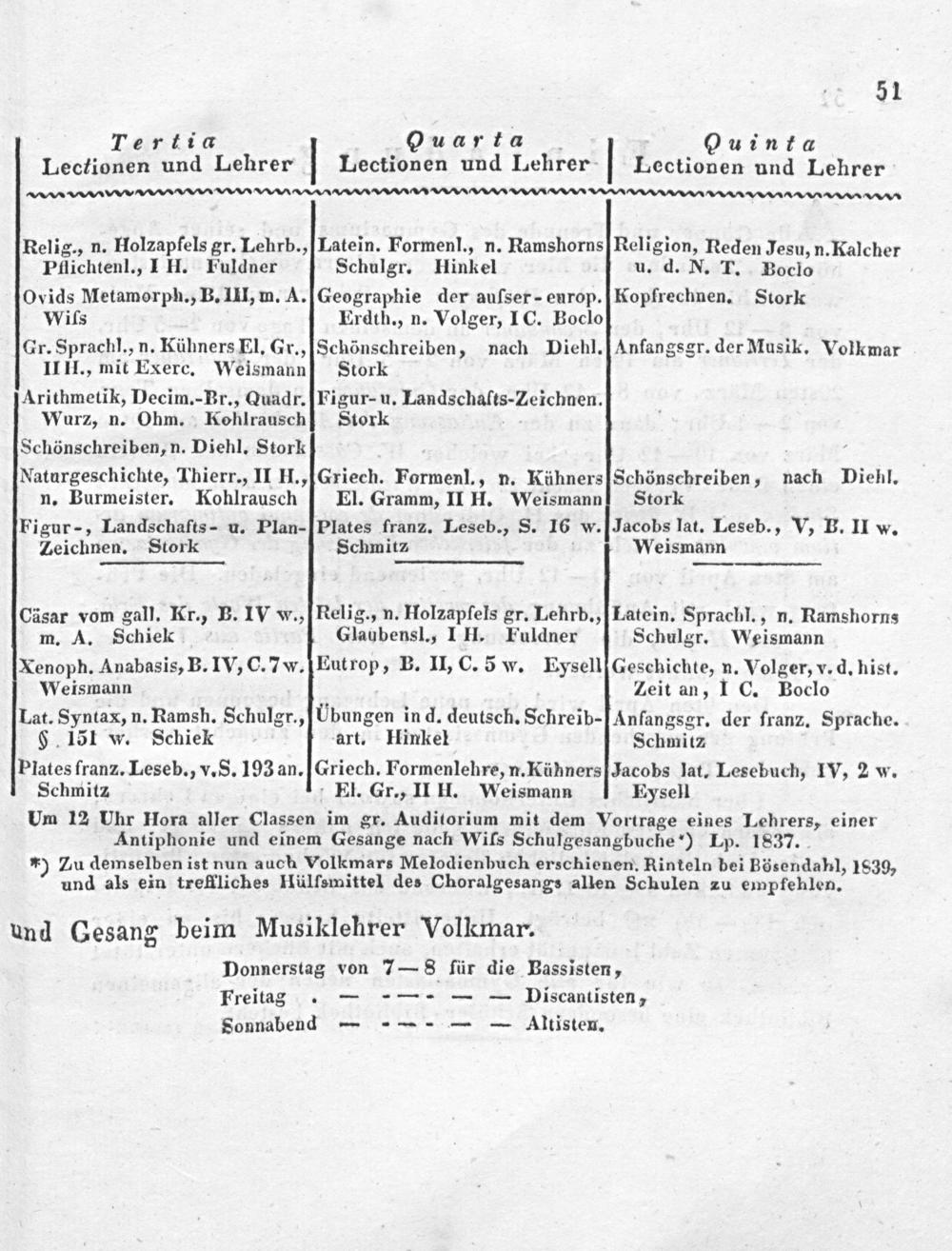 Um 12 Uhr Hora aller Classen im gr. Auditorium mit dem Vortrage eines Lehrers, einer Antiphonie und einem Gesange nach Wiſs Schulgesangbuche*) Lp. 1837. *) Zu demselben ist nun auch Volkmars Melodienbuch erschienen. Rinteln bei Bösendahl, 1839, und als ein treffliches Hülfsmittel des Choralgesangs allen Schulen zu empfehlen.