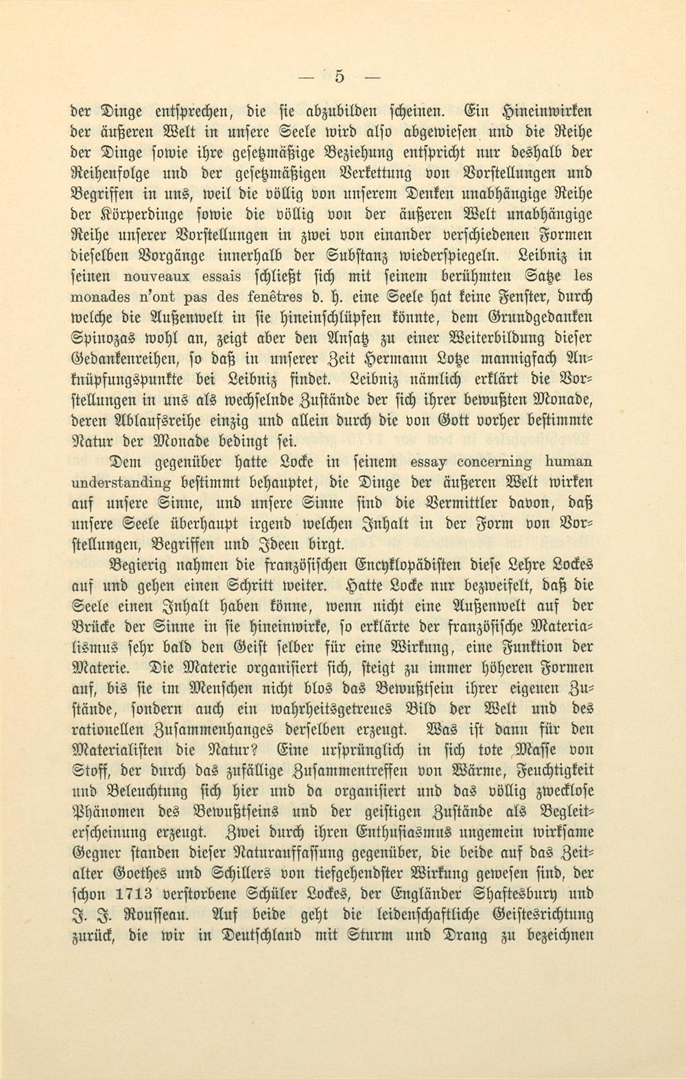 Begierig nahmen die franzöſiſchen Encyklopädiſten dieſe Lehre Lockes auf und gehen einen Schritt weiter. Hatte Locke nur bezweifelt, daß die Seele einen Inhalt haben könne, wenn nicht eine Außenwelt auf der Brücke der Sinne in ſie hineinwirke, ſo erklärte der franzöſiſche Materia⸗ lismus ſehr bald den Geiſt ſelber für eine Wirkung, eine Funktion der Materie. Die Materie organiſiert ſich, ſteigt zu immer höheren Formen auf, bis ſie im Menſchen nicht blos das Bewußtſein ihrer eigenen Zu⸗ ſtände, ſondern auch ein wahrheitsgetreues Bild der Welt und des rationellen Zuſammenhanges derſelben erzeugt. Was iſt dann für den Materialiſten die Natur? Eine urſprünglich in ſich tote Maſſe von Stoff, der durch das zufällige Zuſammentreffen von Wärme, Feuchtigkeit und Beleuchtung ſich hier und da organiſiert und das völlig zweckloſe Phänomen des Bewußtſeins und der geiſtigen Zuſtände als Begleit⸗ erſcheinung erzeugt. Zwei durch ihren Enthuſiasmus ungemein wirkſame Gegner ſtanden dieſer Naturauffaſſung gegenüber, die beide auf das Zeit⸗ alter Goethes und Schillers von tiefgehendſter Wirkung geweſen ſind, der ſchon 1713 verſtorbene Schüler Lockes, der Engländer Shaftesbury und J. J. Rouſſeau. Auf beide geht die leidenſchaftliche Geiſtesrichtung zurück, die wir in Deutſchland mit Sturm und Drang zu bezeichnen