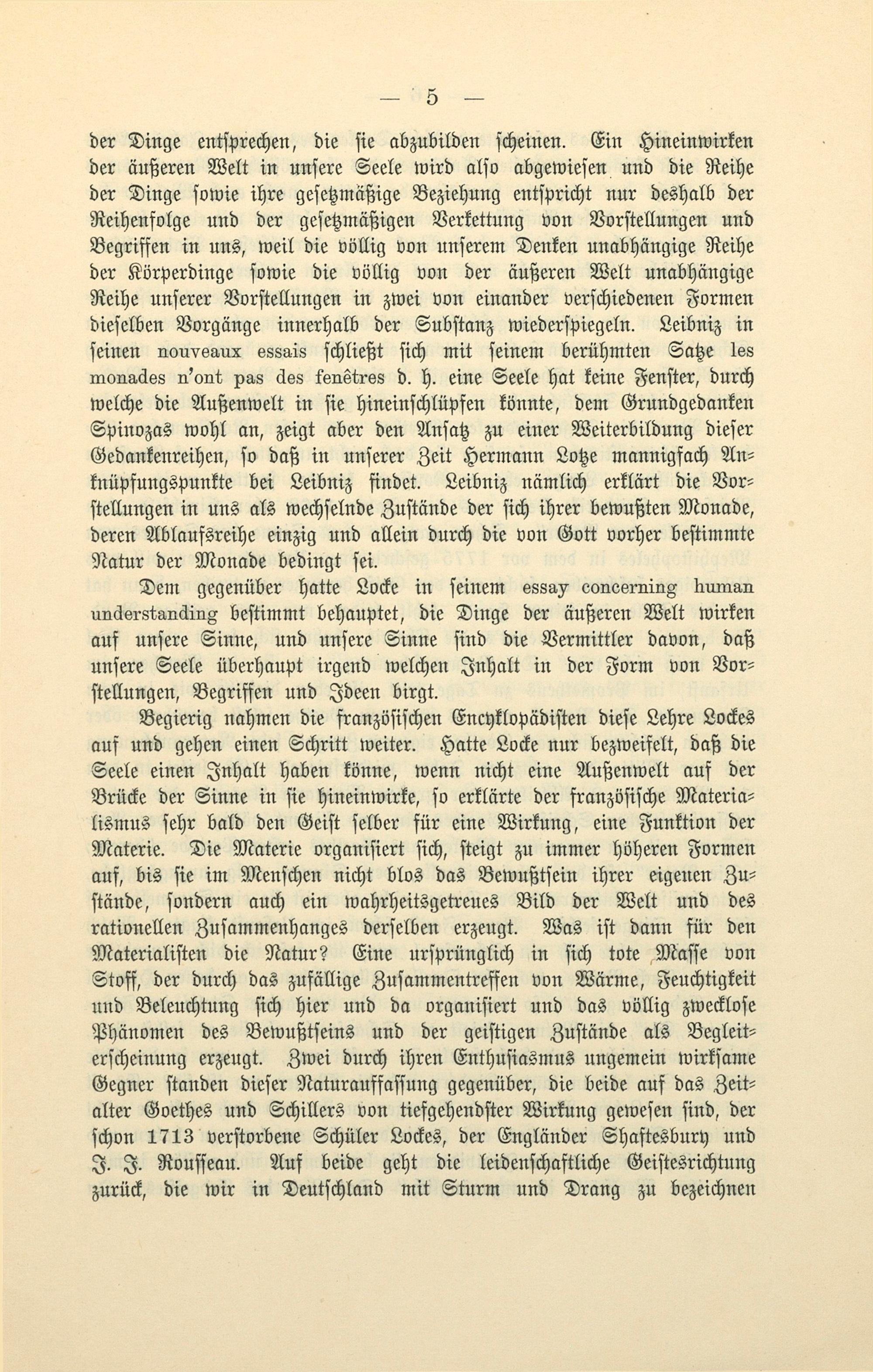 der Dinge entſprechen, die ſie abzubilden ſcheinen. Ein Hineinwirken der äußeren Welt in unſere Seele wird alſo abgewieſen und die Reihe der Dinge ſowie ihre geſetzmäßige Beziehung entſpricht nur deshalb der Reihenfolge und der geſetzmäßigen Verkettung von Vorſtellungen und Begriffen in uns, weil die völlig von unſerem Denken unabhängige Reihe der Körperdinge ſowie die völlig von der äußeren Welt unabhängige Reihe unſerer Vorſtellungen in zwei von einander verſchiedenen Formen dieſelben Vorgänge innerhalb der Subſtanz wiederſpiegeln. Leibniz in ſeinen nouveaux essais ſchließt ſich mit ſeinem berühmten Satze les monades n'ont pas des fenêtres d. h. eine Seele hat keine Fenſter, durch welche die Außenwelt in ſie hineinſchlüpfen könnte, dem Grundgedanken Spinozas wohl an, zeigt aber den Anſatz zu einer Weiterbildung dieſer Gedankenreihen, ſo daß in unſerer Zeit Hermann Lotze mannigfach An⸗ knüpfungspunkte bei Leibniz findet. Leibniz nämlich erklärt die Vor⸗ ſtellungen in uns als wechſelnde Zuſtände der ſich ihrer bewußten Monade, deren Ablaufsreihe einzig und allein durch die von Gott vorher beſtimmte Natur der Monade bedingt ſei.