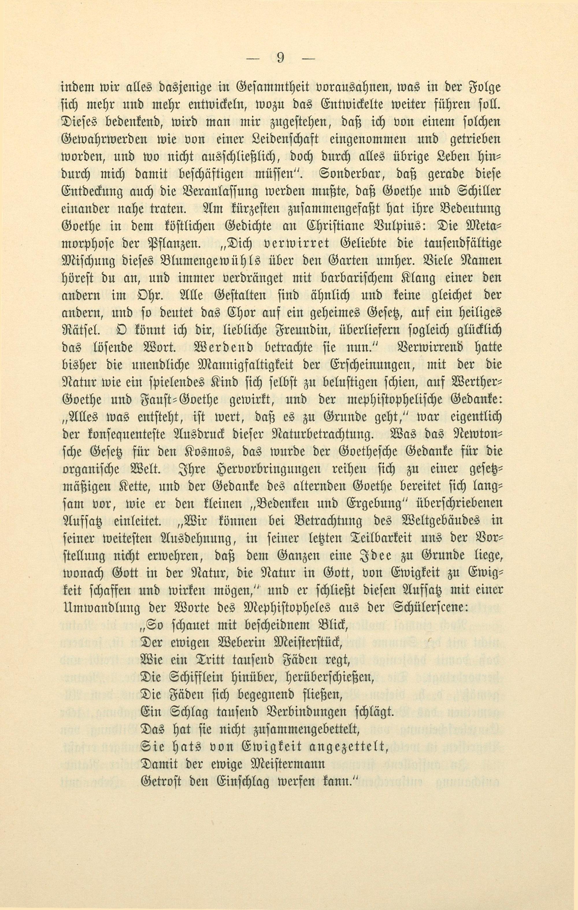 indem wir alles dasjenige in Geſammtheit vorausahnen, was in der Folge ſich mehr und mehr entwickeln, wozu das Entwickelte weiter führen ſoll. Dieſes bedenkend, wird man mir zugeſtehen, daß ich von einem ſolchen Gewahrwerden wie von einer Leidenſchaft eingenommen und getrieben worden, und wo nicht ausſchließlich, doch durch alles übrige Leben hin⸗ durch mich damit beſchäftigen müſſen“. Sonderbar, daß gerade dieſe Entdeckung auch die Veranlaſſung werden mußte, daß Goethe und Schiller einander nahe traten. Am kürzeſten zuſammengefaßt hat ihre Bedeutung Goethe in dem köſtlichen Gedichte an Chriſtiane Vulpius: Die Meta⸗ morphoſe der Pflanzen.„Dich verwirret Geliebte die tauſendfältige Miſchung dieſes Blumengewühls über den Garten umher. Viele Namen höreſt du an, und immer verdränget mit barbariſchem Klang einer den andern im Ohr. Alle Geſtalten ſind ähnlich und keine gleichet der andern, und ſo deutet das Chor auf ein geheimes Geſetz, auf ein heiliges Rätſel. O könnt ich dir, liebliche Freundin, überliefern ſogleich glücklich das löſende Wort. Werdend betrachte ſie nun.“ Verwirrend hatte bisher die unendliche Mannigfaltigkeit der Erſcheinungen, mit der die Natur wie ein ſpielendes Kind ſich ſelbſt zu beluſtigen ſchien, auf Werther⸗ Goethe und Fauſt⸗Goethe gewirkt, und der mephiſtopheliſche Gedanke: „Alles was entſteht, iſt wert, daß es zu Grunde geht,“ war eigentlich der konſequenteſte Ausdruck dieſer Naturbetrachtung. Was das Newton⸗ ſche Geſetz für den Kosmos, das wurde der Goetheſche Gedanke für die organiſche Welt. Ihre Hervorbringungen reihen ſich zu einer geſetz⸗ mäßigen Kette, und der Gedanke des alternden Goethe bereitet ſich lang⸗ ſam vor, wie er den kleinen„Bedenken und Ergebung“ überſchriebenen Aufſatz einleitet.„Wir können bei Betrachtung des Weltgebäudes in ſeiner weiteſten Ausdehnung, in ſeiner letzten Teilbarkeit uns der Vor⸗ ſtellung nicht erwehren, daß dem Ganzen eine Idee zu Grunde liege, wonach Gott in der Natur, die Natur in Gott, von Ewigkeit zu Ewig⸗ keit ſchaffen und wirken mögen,“ und er ſchließt dieſen Aufſatz mit einer Umwandlung der Worte des Mepbhiſtopheles aus der Schülerſcene: