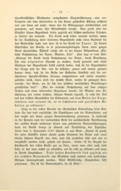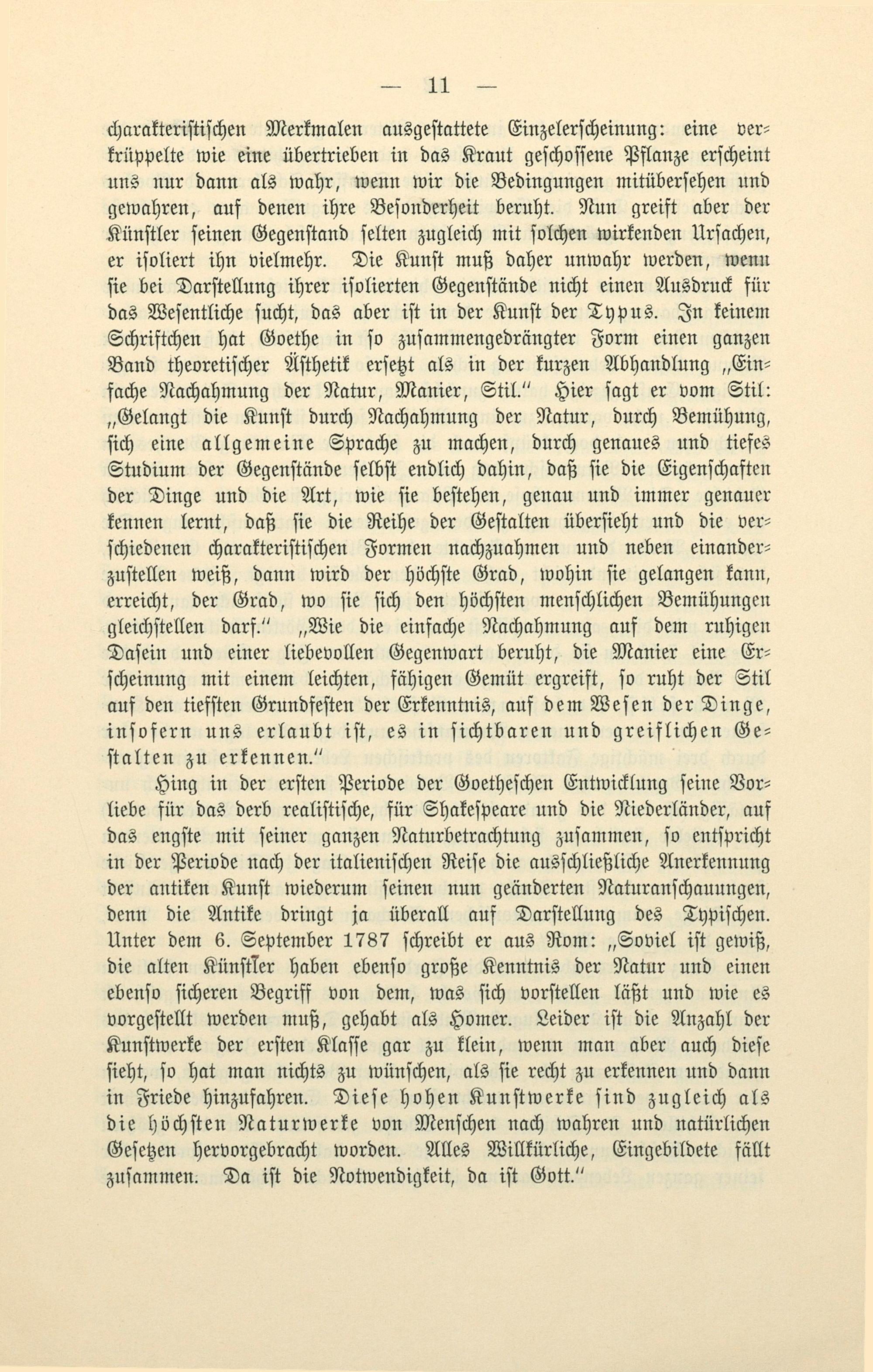 Hing in der erſten Periode der Goetheſchen Entwicklung ſeine Vor⸗ liebe für das derb realiſtiſche, für Shakeſpeare und die Niederländer, auf das engſte mit ſeiner ganzen Naturbetrachtung zuſammen, ſo entſpricht in der Periode nach der italieniſchen Reiſe die ausſchließliche Anerkennung der antiken Kunſt wiederum ſeinen nun geänderten Naturanſchauungen, denn die Antike dringt ja überall auf Darſtellung des Typiſchen. Unter dem 6. September 1787 ſchreibt er aus Rom:„Soviel iſt gewiß, die alten Künſtler haben ebenſo große Kenntnis der Natur und einen ebenſo ſicheren Begriff von dem, was ſich vorſtellen läßt und wie es vorgeſtellt werden muß, gehabt als Homer. Leider iſt die Anzahl der Kunſtwerke der erſten Klaſſe gar zu klein, wenn man aber auch dieſe ſieht, ſo hat man nichts zu wünſchen, als ſie recht zu erkennen und dann in Friede hinzufahren. Dieſe hohen Kunſtwerke ſind zugleich als die höchſten Naturwerke von Menſchen nach wahren und natürlichen Geſetzen hervorgebracht worden. Alles Willkürliche, Eingebildete fällt zuſammen. Da iſt die Notwendigkeit, da iſt Gott.“