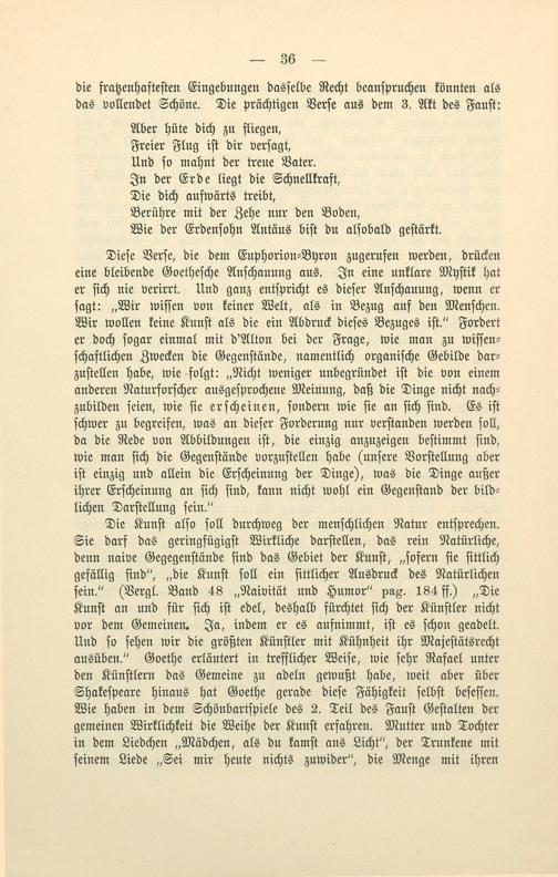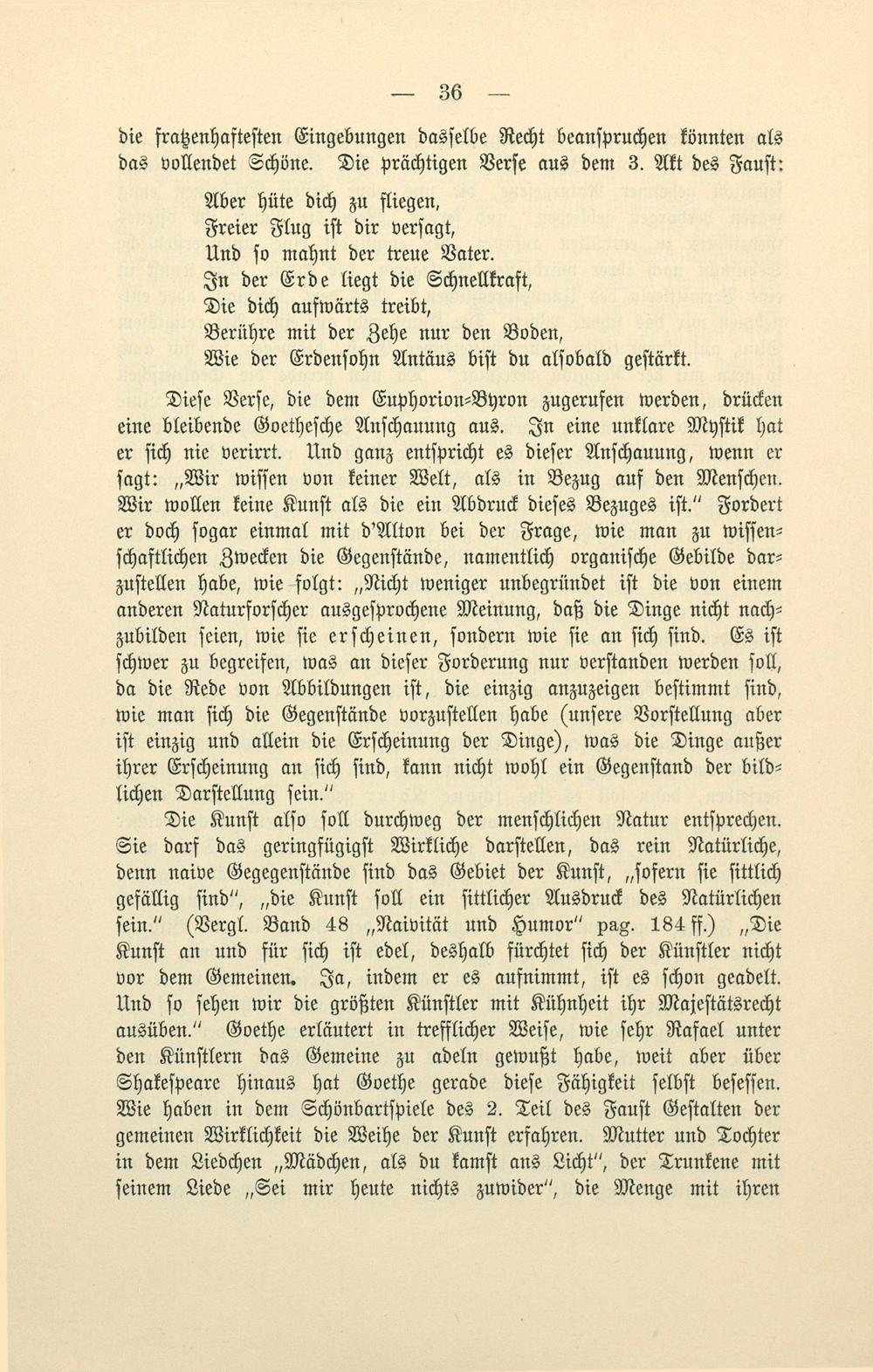 Die Kunſt alſo ſoll durchweg der menſchlichen Natur entſprechen. Sie darf das geringfügigſt Wirkliche darſtellen, das rein Natürliche, denn naive Gegegenſtände ſind das Gebiet der Kunſt,„ſofern ſie ſittlich gefällig ſind“,„die Kunſt ſoll ein ſittlicher Ausdruck des Natürlichen ſein.“(Vergl. Band 48„Naivität und Humor“ pag. 184 ff.)„Die Kunſt an und für ſich iſt edel, deshalb fürchtet ſich der Künſtler nicht vor dem Gemeinen. Ja, indem er es aufnimmt, iſt es ſchon geadelt. Und ſo ſehen wir die größten Künſtler mit Kühnheit ihr Majeſtätsrecht ausüben.“ Goethe erläutert in trefflicher Weiſe, wie ſehr Rafael unter den Künſtlern das Gemeine zu adeln gewußt habe, weit aber über Shakeſpeare hinaus hat Goethe gerade dieſe Fähigkeit ſelbſt beſeſſen. Wie haben in dem Schönbartſpiele des 2. Teil des Fauſt Geſtalten der gemeinen Wirklichkeit die Weihe der Kunſt erfahren. Mutter und Tochter in dem Liedchen„Mädchen, als du kamſt ans Licht“, der Trunkene mit ſeinem Liede„Sei mir heute nichts zuwider“, die Menge mit ihren