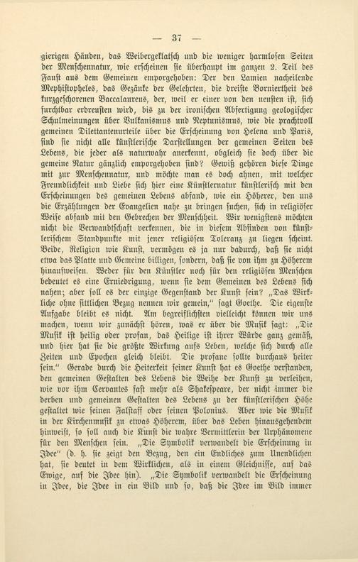 gierigen Händen, das Weibergeklatſch und die weniger harmloſen Seiten der Menſchennatur, wie erſcheinen ſie überhaupt im ganzen 2. Teil des Fauſt aus dem Gemeinen emporgehoben: Der den Lamien nacheilende Mephiſtopheles, das Gezänke der Gelehrten, die dreiſte Borniertheit des kurzgeſchorenen Baccalaureus, der, weil er einer von den neuſten iſt, ſich furchtbar erdreuſten wird, bis zu der ironiſchen Abfertigung geologiſcher Schulmeinungen über Vulkanismus und Neptunismus, wie die prachtvoll gemeinen Dilettantenurteile über die Erſcheinung von Helena und Paris, ſind ſie nicht alle künſtleriſche Darſtellungen der gemeinen Seiten des Lebens, die jeder als naturwahr anerkennt, obgleich ſie doch über die gemeine Natur gänzlich emporgehoben ſind? Gewiß gehören dieſe Dinge mit zur Menſchennatur, und möchte man es doch ahnen, mit welcher Freundlichkeit und Liebe ſich hier eine Künſtlernatur künſtleriſch mit den Erſcheinungen des gemeinen Lebens abfand, wie ein Höherer, den uns die Erzählungen der Evangelien nahe zu bringen ſuchen, ſich in religiöſer Weiſe abfand mit den Gebrechen der Menſchheit. Wir wenigſtens möchten nicht die Verwandtſchaft verkennen, die in dieſem Abfinden von künſt⸗ leriſchem Standpunkte mit jener religiöſen Toleranz zu liegen ſcheint. Beide, Religion wie Kunſt, vermögen es ja nur dadurch, daß ſie nicht etwa das Platte und Gemeine billigen, ſondern, daß ſie von ihm zu Höherem hinaufweiſen. Weder für den Künſtler noch für den religiöſen Menſchen bedeutet es eine Erniedrigung, wenn ſie dem Gemeinen des Lebens ſich nahen; aber ſoll es der einzige Gegenſtand der Kunſt ſein?„Das Wirk⸗ liche ohne ſittlichen Bezug nennen wir gemein,“ ſagt Goethe. Die eigenſte Aufgabe bleibt es nicht. Am begreiflichſten vielleicht können wir uns machen, wenn wir zunächſt hören, was er über die Muſik ſagt:„Die Muſik iſt heilig oder profan, das Heilige iſt ihrer Würde ganz gemäß, und hier hat ſie die größte Wirkung aufs Leben, welche ſich durch alle Zeiten und Epochen gleich bleibt. Die profane ſollte durchaus heiter ſein.“ Gerade durch die Heiterkeit ſeiner Kunſt hat es Goethe verſtanden, den gemeinen Geſtalten des Lebens die Weihe der Kunſt zu verleihen, wie vor ihm Cervantes faſt mehr als Shakeſpeare, der nicht immer die derben und gemeinen Geſtalten des Lebens zu der künſtleriſchen Höhe geſtaltet wie ſeinen Falſtaff oder ſeinen Polonius. Aber wie die Muſik in der Kirchenmuſik zu etwas Höherem, über das Leben hinausgehendem hinweiſt, ſo ſoll auch die Kunſt die wahre Vermittlerin der Urphänomene für den Menſchen ſein.„Die Symbolik verwandelt die Erſcheinung in Idee“(d. h. ſie zeigt den Bezug, den ein Endliches zum Unendlichen hat, ſie deutet in dem Wirklichen, als in einem Gleichniſſe, auf das Ewige, auf die Idee hin).„Die Symbolik verwandelt die Erſcheinung in Idee, die Idee in ein Bild und ſo, daß die Idee im Bild immer