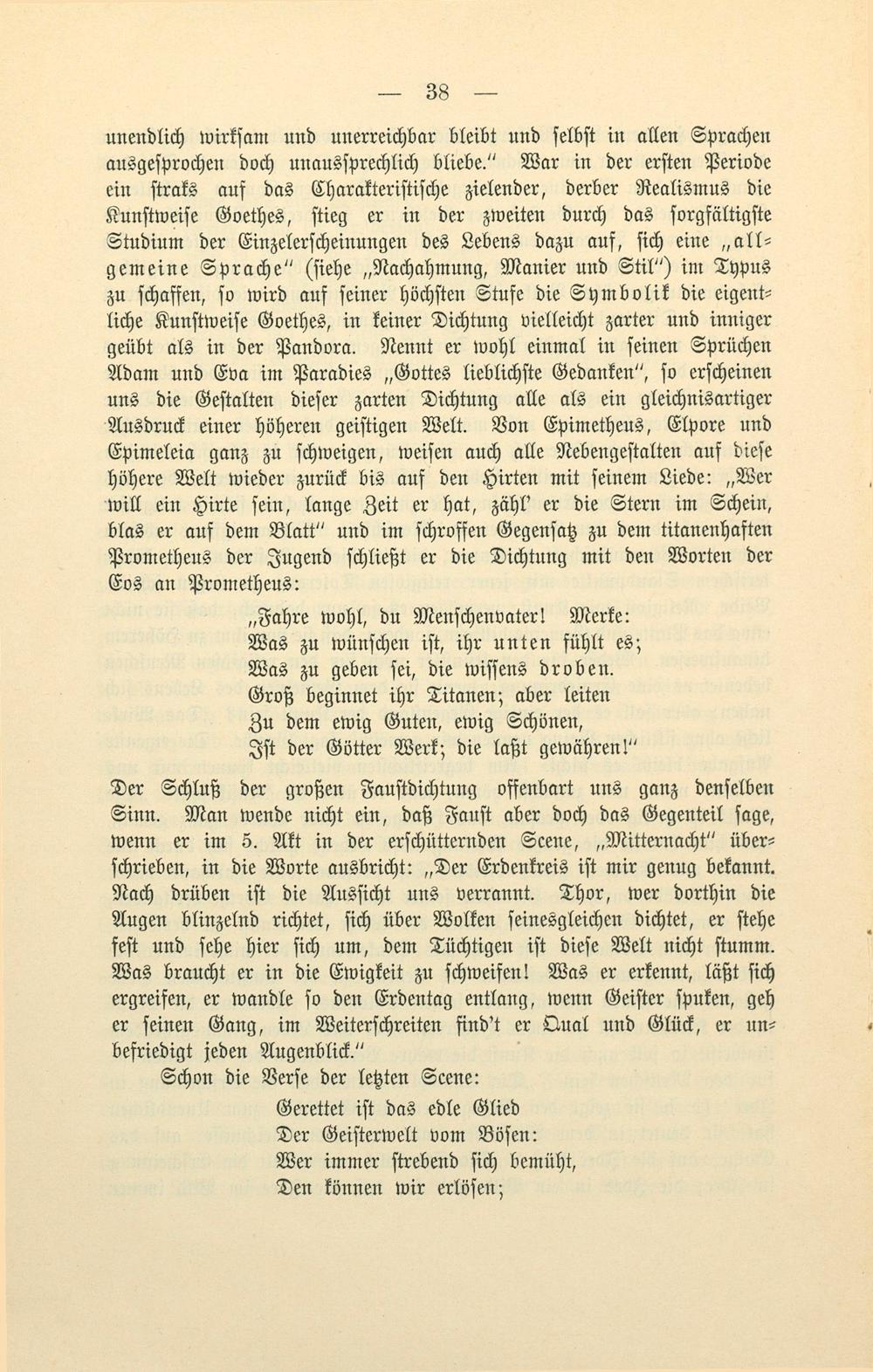 unendlich wirkſam und unerreichbar bleibt und ſelbſt in allen Sprachen ausgeſprochen doch unausſprechlich bliebe.“ War in der erſten Periode ein ſtraks auf das Charakteriſtiſche zielender, derber Realismus die Kunſtweiſe Goethes, ſtieg er in der zweiten durch das ſorgfältigſte Studium der Einzelerſcheinungen des Lebens dazu auf, ſich eine„all⸗ gemeine Sprache“(ſiehe„Nachahmung, Manier und Stil“) im Typus zu ſchaffen, ſo wird auf ſeiner höchſten Stufe die Symbolik die eigent⸗ liche Kunſtweiſe Goethes, in keiner Dichtung vielleicht zarter und inniger geübt als in der Pandora. Nennt er wohl einmal in ſeinen Sprüchen Adam und Eva im Paradies„Gottes lieblichſte Gedanken“, ſo erſcheinen uns die Geſtalten dieſer zarten Dichtung alle als ein gleichnisartiger Ausdruck einer höheren geiſtigen Welt. Von Epimetheus, Elpore und Epimeleia ganz zu ſchweigen, weiſen auch alle Nebengeſtalten auf dieſe höhere Welt wieder zurück bis auf den Hirten mit ſeinem Liede:„Wer will ein Hirte ſein, lange Zeit er hat, zähl' er die Stern im Schein, blas er auf dem Blatt“ und im ſchroffen Gegenſatz zu dem titanenhaften Prometheus der Jugend ſchließt er die Dichtung mit den Worten der Eos an Prometheus: