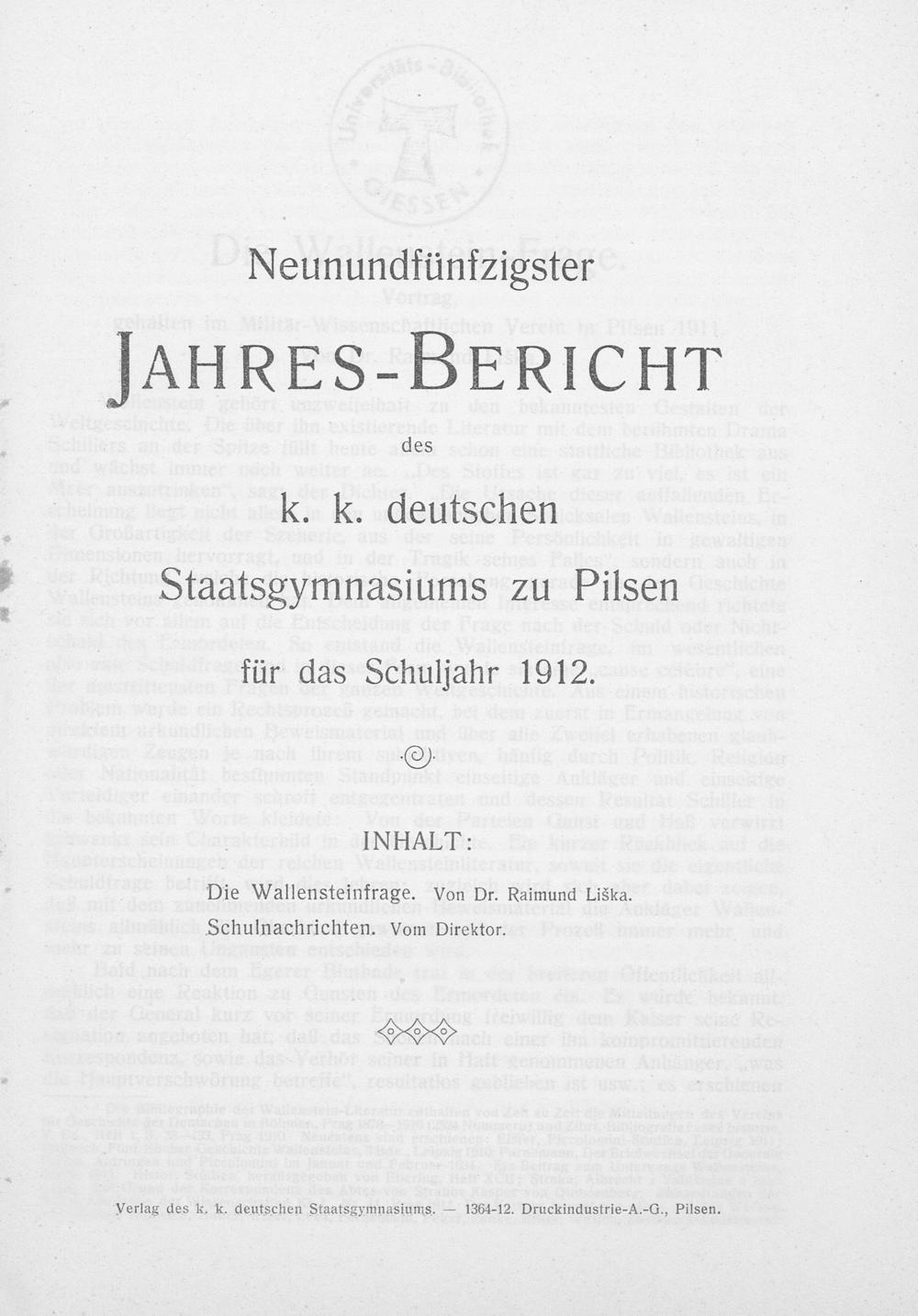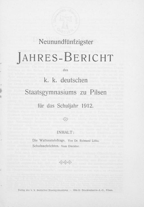 Verlag des k. k. deutschen Staatsgymnasiums.— 1364-12. Druckindustrie-A.-G., Pilsen.