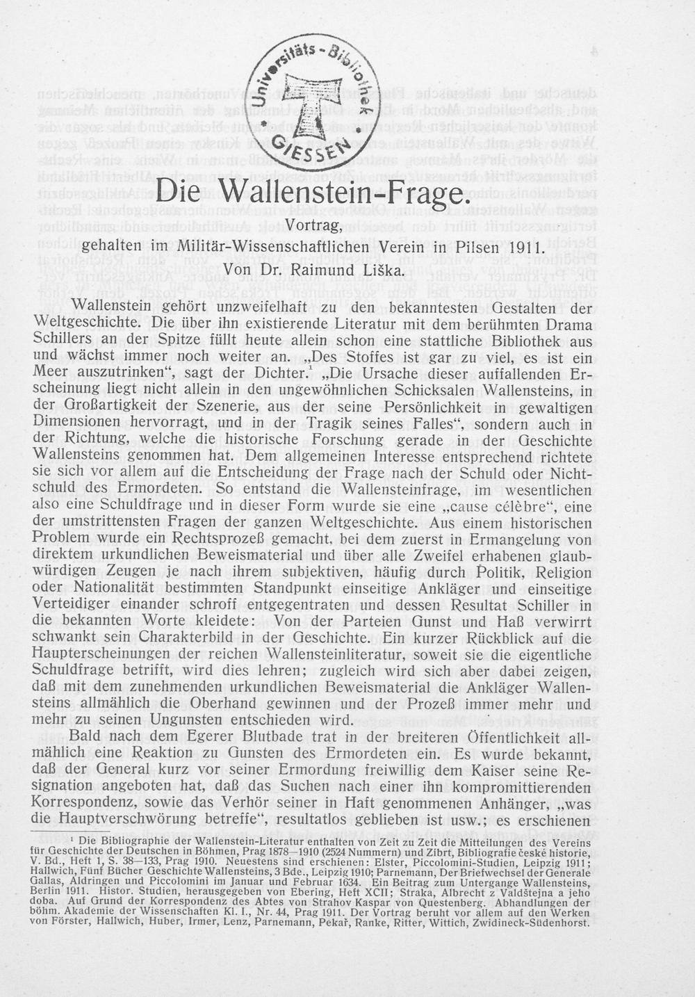 ¹ Die Bibliographie der Wallenstein-Literatur enthalten von Zeit zu Zeit die Mitteilungen des Vereins für Geschichte der Deutschen in Böhmen, Prag 1878. 1910(2524 Nummern) und Zibrt, Bibliografie&eské historie, V. Bd., Heft 1, 8. 38— 133, Prag 1910. Neuestens sind erschienen: Elstér, Piccolomini-Studien, Leipzig 1911; Hallwich, Fünf Bücher Geschichte Wallensteins, 3 Bde., Leipzig 1910; Parnemann, Der Briefwechsel der Generale Gallas, Aldringen und Piccolomini im Januar und Februar 1634. Ein Beitrag zum Untergange Wallensteins, Berlin 1911. Histor. Studien, herausgegeben von Ebering, Heft XCII; Straka, Albrecht z Valdsteina a jeho doba. Auf Grund der Korrespondenz des Abtes von Strahov Kkaspar von Questenberg. Abhandlungen der böhm. Akademie der Wissenschaften kl. I., Nr. 44, Prag 1911. Der Vortrag beruht vor allem auf den Werken von Förster, Hallwich, Huber, Irmer, Lenz, Parnemann, Pekaf, Ranke, Ritter, Wittich, Zwidineck-Südenhorst.