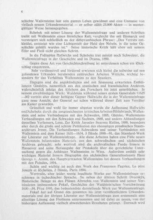 Wertvolle, aber leider wenig beachtete Werke zur Wallensteinfrage er- schienen in tschechischer Sprache. So neben der älteren Schrift Dvorskys, Historische Belege zu den Plänen Albrechts von Wallenstein und seiner Ver- bündeten insbesondere Pekaf, Geschichte der Waldstein'schen Verschwörung 1630— 34, Prag 1895, das bedeutendste darstellende Werk zur Wallensteinfrage.
