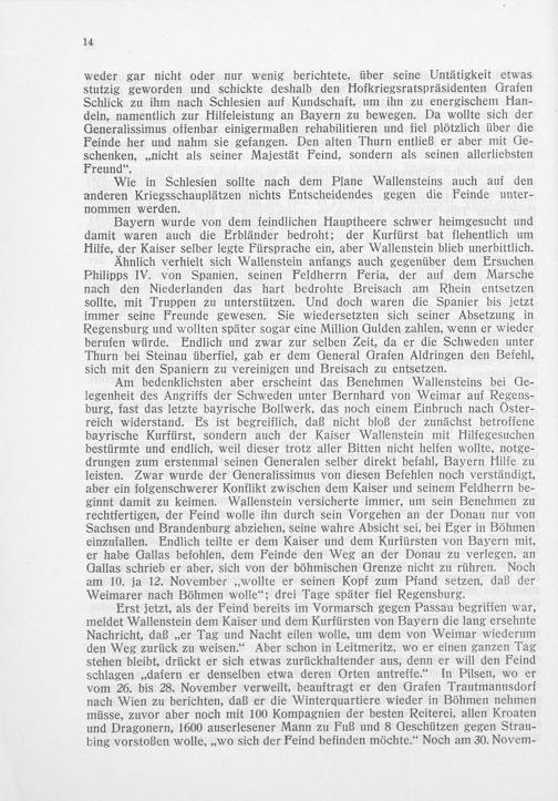 Am bedenklichsten aber erscheint das Benehmen Wallensteins bei Ge- legenheit des Angriffs der Schweden unter Bernhard von Weimar auf Regens- burg, fast das letzte bayrische Bollwerk, das noch einem Einbruch nach Oster- reich widerstand. Es ist begreiflich, daß nicht bloß der zunächst betroffene bayrische Kurfürst, sondern auch der Kaiser Wallenstein mit Hilfegesuchen bestürmte und endlich, weil dieser trotz aller Bitten nicht helfen wollte, notge- drungen zum erstenmal seinen Generalen selber direkt befahl, Bayern Hilfe zu leisten. Zwar wurde der Generalissimus von diesen Befehlen noch verständigt, aber ein folgenschwerer Konflikt zwischen dem Kaiser und seinem Feldherrn be- ginnt damit zu keimen. Wallenstein versicherte immer, um sein Benehmen zu rechtfertigen, der Feind wolle ihn durch sein Vorgehen an der Donau nur von Sachsen und Brandenburg abziehen, seine wahre Absicht sei, bei Eger in Böhmen einzufallen. Endlich teilte er dem Kaiser und dem Kurfürsten von Bayern mit, er habe Gallas befohlen, dem Feinde den Weg an der Donau zu verlegen, an Gallas schrieb er aber, sich von der böhmischen Grenze nicht zu rühren. Noch am 10. ja 12. November„wollte er seinen Kopf zum Pfand setzen, daß der Weimarer nach Böhmen wolle“; drei Tage später fiel Regensburg.