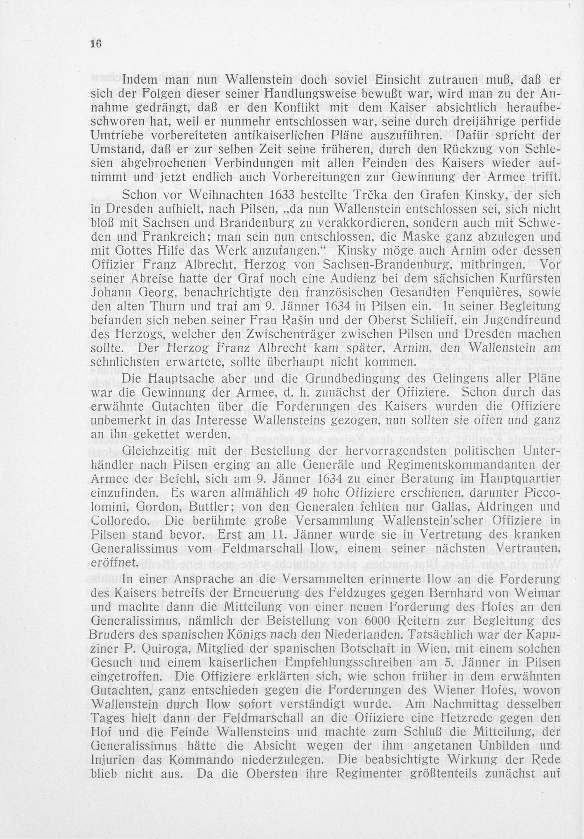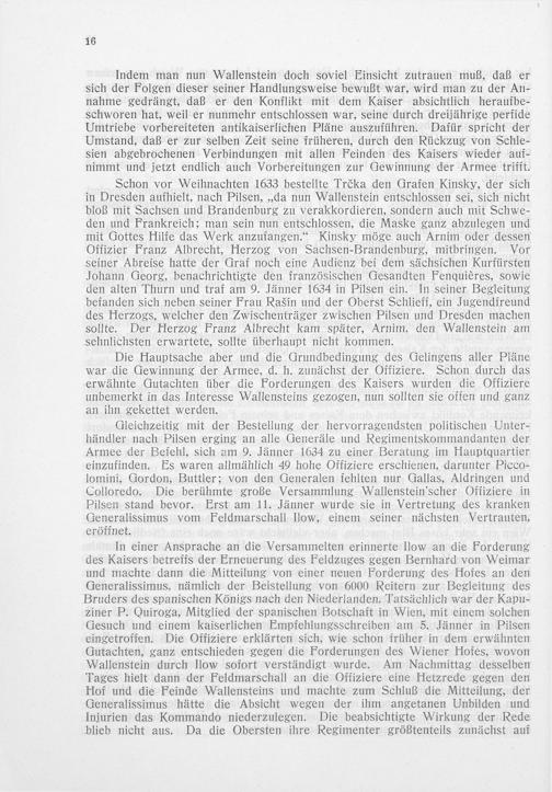 In einer Ansprache an die Versammelten erinnerte Ilow an die Forderung des Kaisers betreffs der Erneuerung des Feldzuges gegen Bernhard von Weimar und machte dann die Mitteilung von einer neuen Forderung des Hofes an den Generalissimus, nämlich der Beistellung von 6000 Reitern zur Begleitung des Bruders des spanischen Königs nach den Niederlanden. Tatsächlich war der Kapu- Ziner P. Quiroga, Mitglied der spanischen Botschaft in Wien, mit einem solchen Gesuch und einem kaiserlichen Empfehlungsschreiben am 5. Jänner in Pilsen eingetroffen. Die Offiziere erklärten sich, wie schon früher in dem erwähnten Gutachten, ganz entschieden gegen die Forderungen des Wiener Hofes, wovon Wallenstein durch Ilow sofort verständigt wurde. Am Nachmittag desselben Tages hielt dann der Feldmarschall an die Offiziere eine Hetzrede gegen den Hof und die Feinde Wallensteins und machte zum Schluß die Mitteilung, der Generalissimus hätte die Absicht wegen der ihm angetanen Unbilden und Iniurien das Kommando niederzulegen. Die beabsichtigte Wirkung der Rede blieb nicht aus. Da die Obersten ihre Regimenter größtenteils zunächst auf