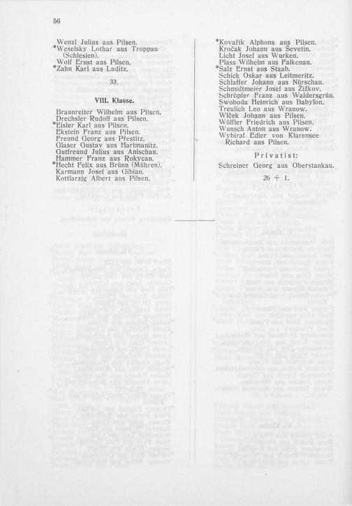 *Kovakik Alphons aus Pilsen. Krogéak Johann aus Sevetin. Licht Josef aus Wurken. Plass Wilhelm aus Falkenau. *Salz Ernst aus Staab. Schick Oskar aus Leitmeritz. Schlaffer Johann aus Nürschan. Schmidtmeier Josef aus Zizkov. Schröpfer Franz aus Waldersgrün. Swoboda Heinrich aus Babylon. Treulich Leo aus Wranow. Wléek Johann aus Pilsen. Wölfler Friedrich aus Pilsen. Wunsch Anton aus Wranow. Wybiral Edler von Klarensee Richard aus Pilsen.